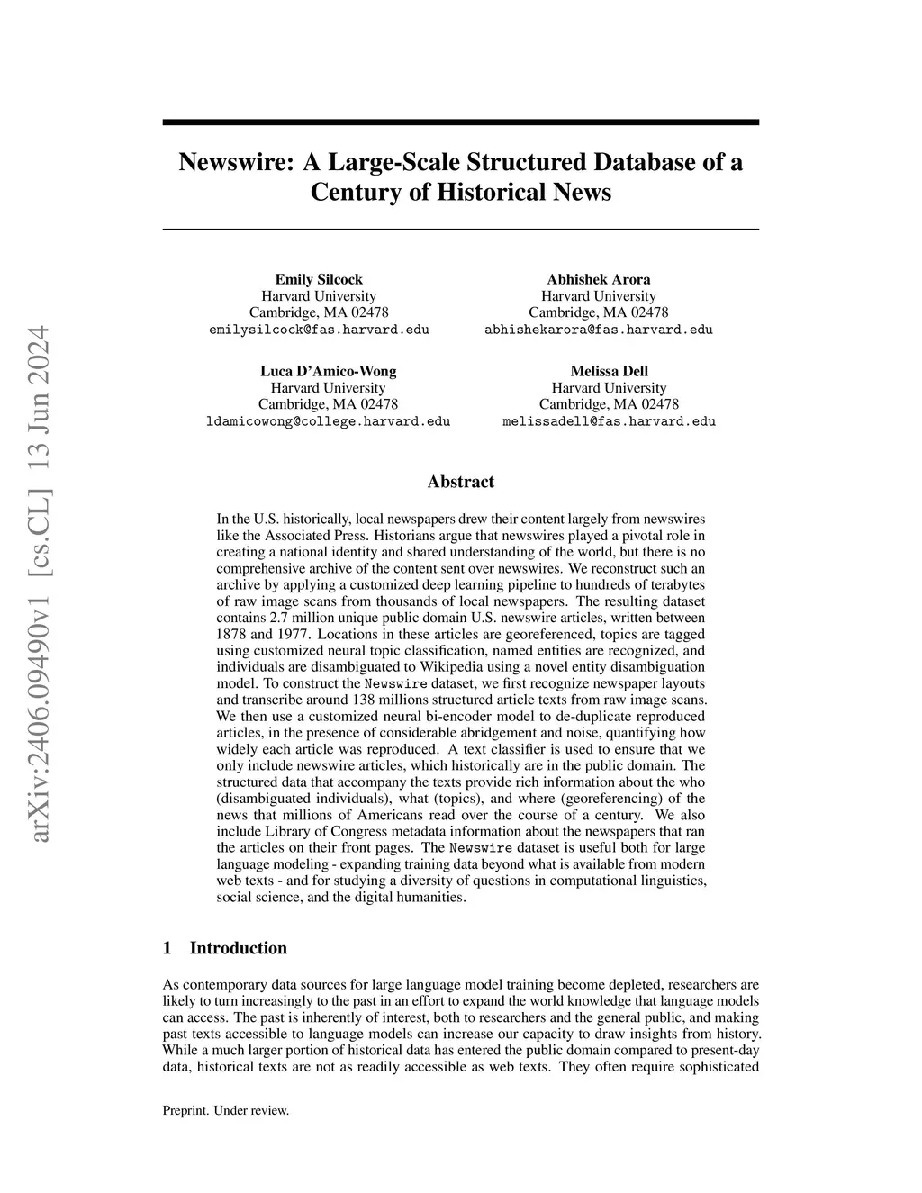 In the U.S. historically, local newspapers drew their content largely from newswires like the Associated Press. Historians argue that newswires played a pivotal role in creating a national identity and shared understanding of the world, but there is no comprehensive archive of the content sent over newswires. We reconstruct such an archive by applying a customized deep learning pipeline to hundreds of terabytes of raw image scans from thousands of local newspapers. The resulting dataset contains 2.7 million unique public domain U.S. newswire articles, written between 1878 and 1977. Locations in these articles are georeferenced, topics are tagged using customized neural topic classification, named entities are recognized, and individuals are disambiguated to Wikipedia using a novel entity disambiguation model. To construct the Newswire dataset, we first recognize newspaper layouts and transcribe around 138 millions structured article texts from raw image scans. We then use a customized neural bi-encoder model to de-duplicate reproduced articles, in the presence of considerable abridgement and noise, quantifying how widely each article was reproduced. A text classifier is used to ensure that we only include newswire articles, which historically are in the public domain. The structured data that accompany the texts provide rich information about the who (disambiguated individuals), what (topics), and where (georeferencing) of the news that millions of Americans read over the course of a century. We also include Library of Congress metadata information about the newspapers that ran the articles on their front pages. The Newswire dataset is useful both for large language modeling - expanding training data beyond what is available from modern web texts - and for studying a diversity of questions in computational linguistics, social science, and the digital humanities.