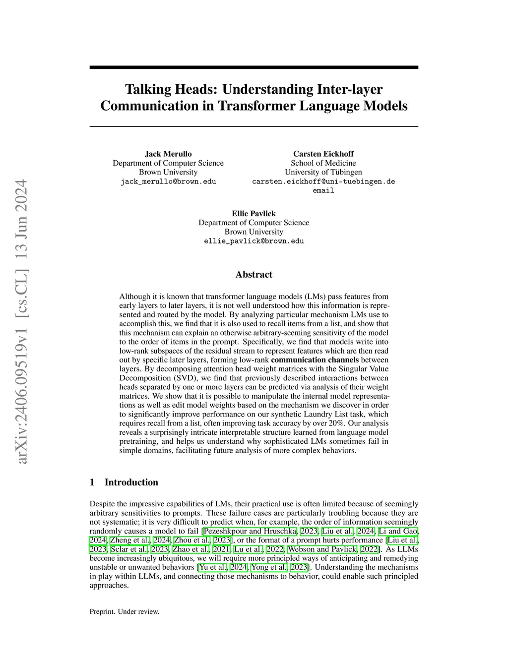 Although it is known that transformer language models (LMs) pass features from early layers to later layers, it is not well understood how this information is represented and routed by the model. By analyzing particular mechanism LMs use to accomplish this, we find that it is also used to recall items from a list, and show that this mechanism can explain an otherwise arbitrary-seeming sensitivity of the model to the order of items in the prompt. Specifically, we find that models write into low-rank subspaces of the residual stream to represent features which are then read out by specific later layers, forming low-rank communication channels between layers. By decomposing attention head weight matrices with the Singular Value Decomposition (SVD), we find that previously described interactions between heads separated by one or more layers can be predicted via analysis of their weight matrices. We show that it is possible to manipulate the internal model representations as well as edit model weights based on the mechanism we discover in order to significantly improve performance on our synthetic Laundry List task, which requires recall from a list, often improving task accuracy by over 20%. Our analysis reveals a surprisingly intricate interpretable structure learned from language model pretraining, and helps us understand why sophisticated LMs sometimes fail in simple domains, facilitating future analysis of more complex behaviors.