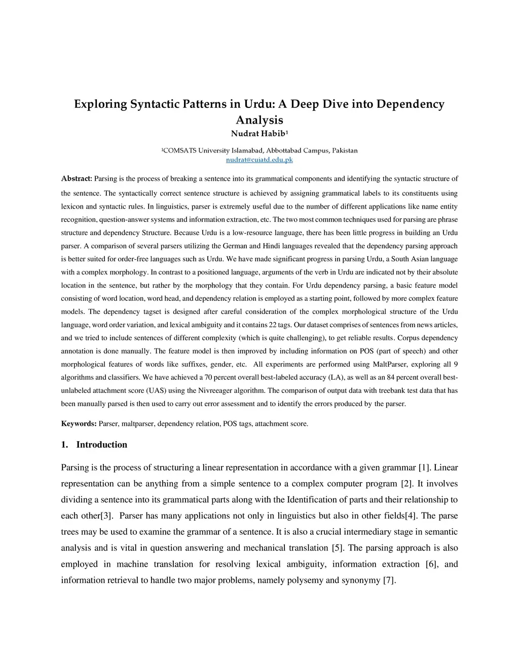 Parsing is the process of breaking a sentence into its grammatical components and identifying the syntactic structure of the sentence. The syntactically correct sentence structure is achieved by assigning grammatical labels to its constituents using lexicon and syntactic rules. In linguistics, parser is extremely useful due to the number of different applications like name entity recognition, QA systems and information extraction, etc. The two most common techniques used for parsing are phrase structure and dependency Structure. Because Urdu is a low-resource language, there has been little progress in building an Urdu parser. A comparison of several parsers revealed that the dependency parsing approach is better suited for order-free languages such as Urdu. We have made significant progress in parsing Urdu, a South Asian language with a complex morphology. For Urdu dependency parsing, a basic feature model consisting of word location, word head, and dependency relation is employed as a starting point, followed by more complex feature models. The dependency tagset is designed after careful consideration of the complex morphological structure of the Urdu language, word order variation, and lexical ambiguity and it contains 22 tags. Our dataset comprises of sentences from news articles, and we tried to include sentences of different complexity (which is quite challenging), to get reliable results. All experiments are performed using MaltParser, exploring all 9 algorithms and classifiers. We have achieved a 70 percent overall best-labeled accuracy (LA), as well as an 84 percent overall best-unlabeled attachment score (UAS) using the Nivreeager algorithm. The comparison of output data with treebank test data that has been manually parsed is then used to carry out error assessment and to identify the errors produced by the parser.