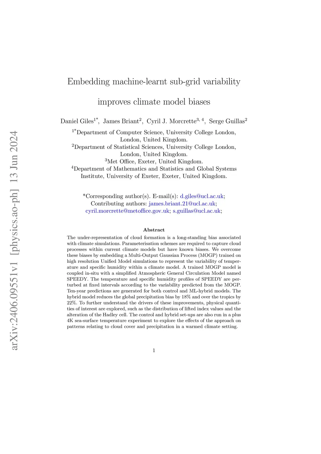 The under-representation of cloud formation is a long-standing bias associated with climate simulations. Parameterisation schemes are required to capture cloud processes within current climate models but have known biases. We overcome these biases by embedding a Multi-Output Gaussian Process (MOGP) trained on high resolution Unified Model simulations to represent the variability of temperature and specific humidity within a climate model. A trained MOGP model is coupled in-situ with a simplified Atmospheric General Circulation Model named SPEEDY. The temperature and specific humidity profiles of SPEEDY are perturbed at fixed intervals according to the variability predicted from the MOGP. Ten-year predictions are generated for both control and ML-hybrid models. The hybrid model reduces the global precipitation bias by 18\% and over the tropics by 22\%. To further understand the drivers of these improvements, physical quantities of interest are explored, such as the distribution of lifted index values and the alteration of the Hadley cell. The control and hybrid set-ups are also run in a plus 4K sea-surface temperature experiment to explore the effects of the approach on patterns relating to cloud cover and precipitation in a warmed climate setting.