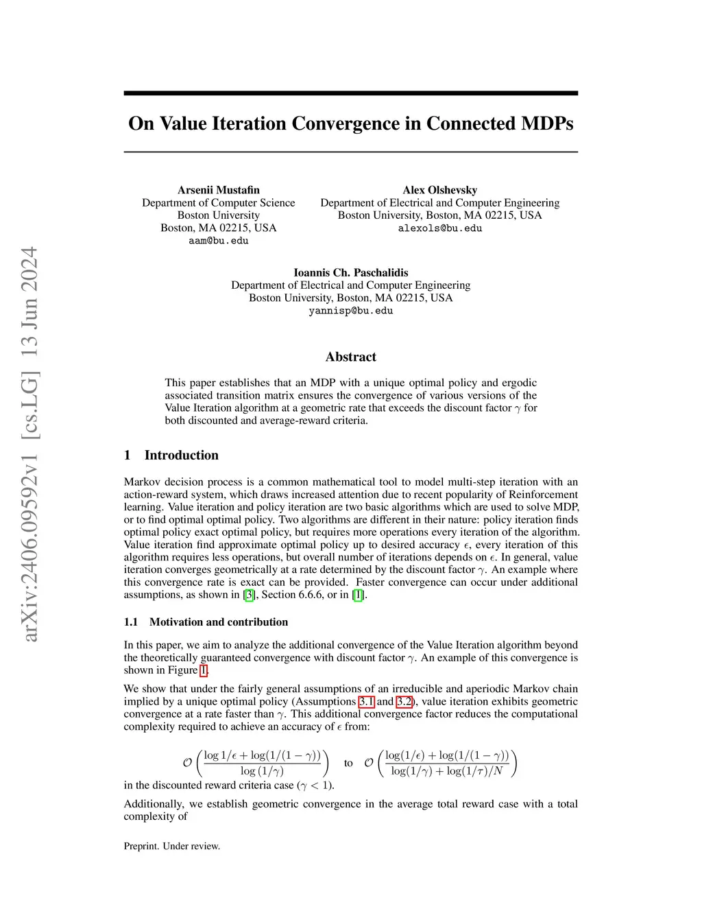 This paper establishes that an MDP with a unique optimal policy and ergodic associated transition matrix ensures the convergence of various versions of the Value Iteration algorithm at a geometric rate that exceeds the discount factor {\gamma} for both discounted and average-reward criteria.