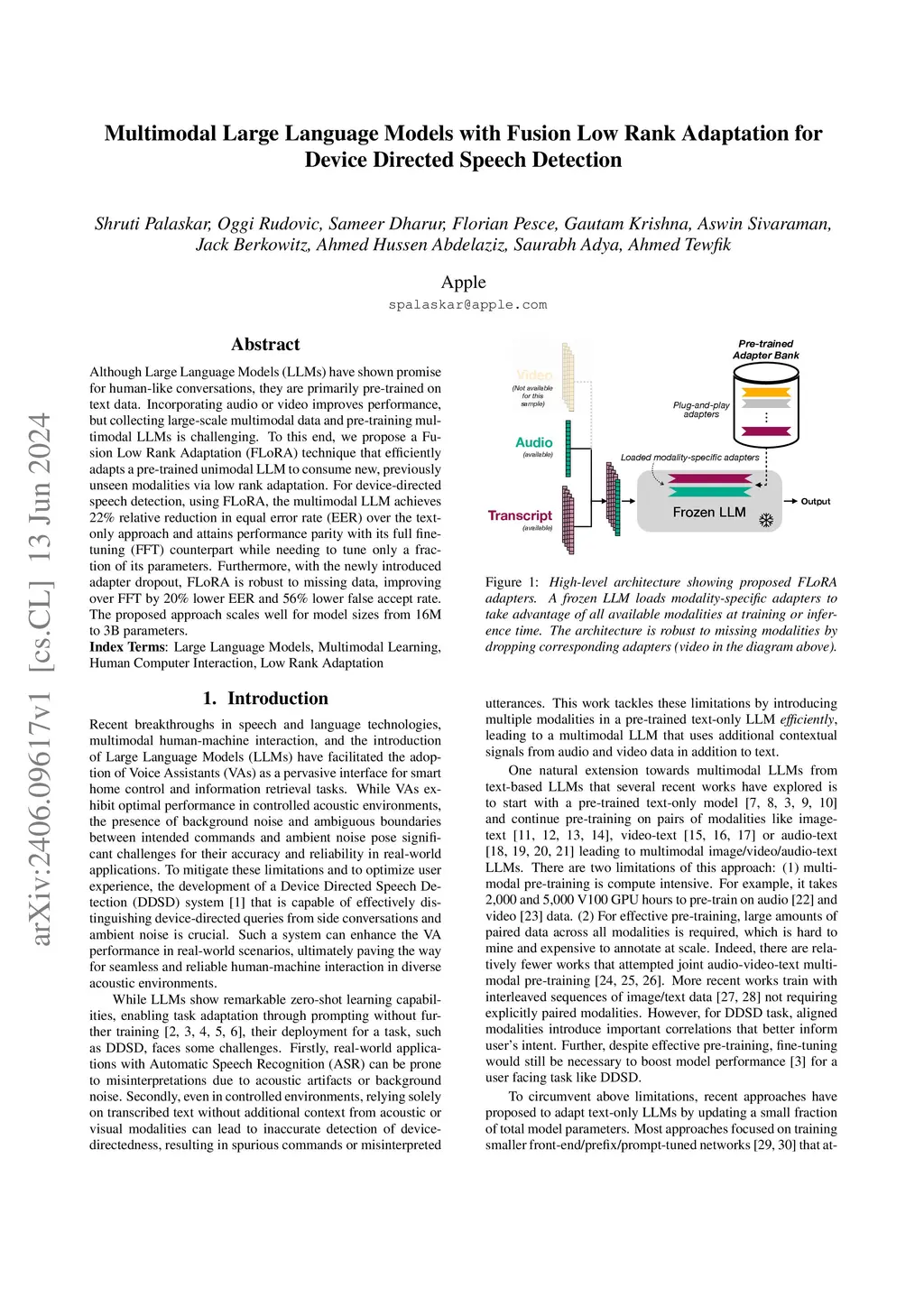 Although Large Language Models (LLMs) have shown promise for human-like conversations, they are primarily pre-trained on text data. Incorporating audio or video improves performance, but collecting large-scale multimodal data and pre-training multimodal LLMs is challenging. To this end, we propose a Fusion Low Rank Adaptation (FLoRA) technique that efficiently adapts a pre-trained unimodal LLM to consume new, previously unseen modalities via low rank adaptation. For device-directed speech detection, using FLoRA, the multimodal LLM achieves 22% relative reduction in equal error rate (EER) over the text-only approach and attains performance parity with its full fine-tuning (FFT) counterpart while needing to tune only a fraction of its parameters. Furthermore, with the newly introduced adapter dropout, FLoRA is robust to missing data, improving over FFT by 20% lower EER and 56% lower false accept rate. The proposed approach scales well for model sizes from 16M to 3B parameters.