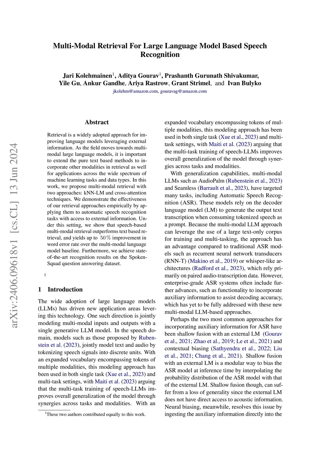 Retrieval is a widely adopted approach for improving language models leveraging external information. As the field moves towards multi-modal large language models, it is important to extend the pure text based methods to incorporate other modalities in retrieval as well for applications across the wide spectrum of machine learning tasks and data types. In this work, we propose multi-modal retrieval with two approaches: kNN-LM and cross-attention techniques. We demonstrate the effectiveness of our retrieval approaches empirically by applying them to automatic speech recognition tasks with access to external information. Under this setting, we show that speech-based multi-modal retrieval outperforms text based retrieval, and yields up to 50 % improvement in word error rate over the multi-modal language model baseline. Furthermore, we achieve state-of-the-art recognition results on the Spoken-Squad question answering dataset.