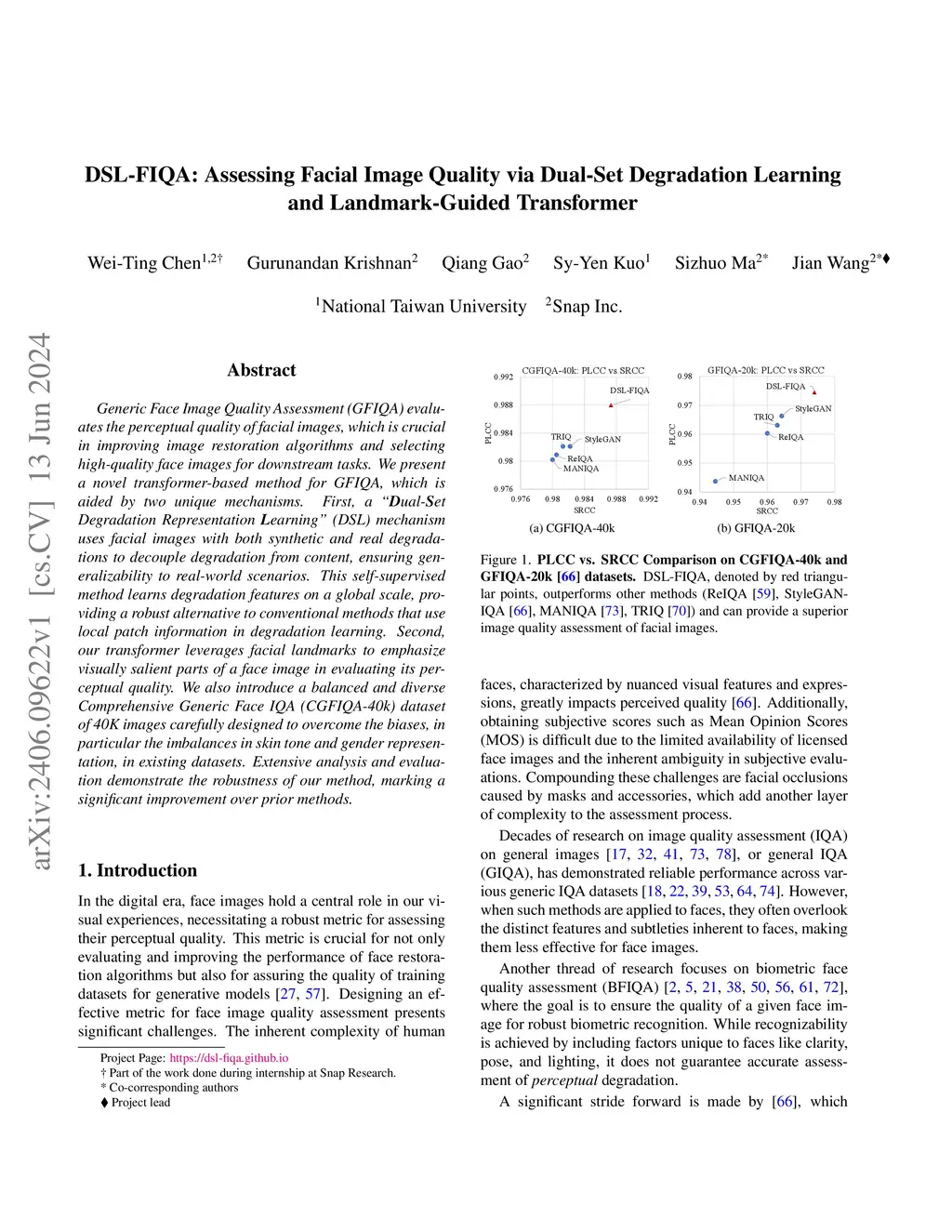 Generic Face Image Quality Assessment (GFIQA) evaluates the perceptual quality of facial images, which is crucial in improving image restoration algorithms and selecting high-quality face images for downstream tasks. We present a novel transformer-based method for GFIQA, which is aided by two unique mechanisms. First, a Dual-Set Degradation Representation Learning (DSL) mechanism uses facial images with both synthetic and real degradations to decouple degradation from content, ensuring generalizability to real-world scenarios. This self-supervised method learns degradation features on a global scale, providing a robust alternative to conventional methods that use local patch information in degradation learning. Second, our transformer leverages facial landmarks to emphasize visually salient parts of a face image in evaluating its perceptual quality. We also introduce a balanced and diverse Comprehensive Generic Face IQA (CGFIQA-40k) dataset of 40K images carefully designed to overcome the biases, in particular the imbalances in skin tone and gender representation, in existing datasets. Extensive analysis and evaluation demonstrate the robustness of our method, marking a significant improvement over prior methods.