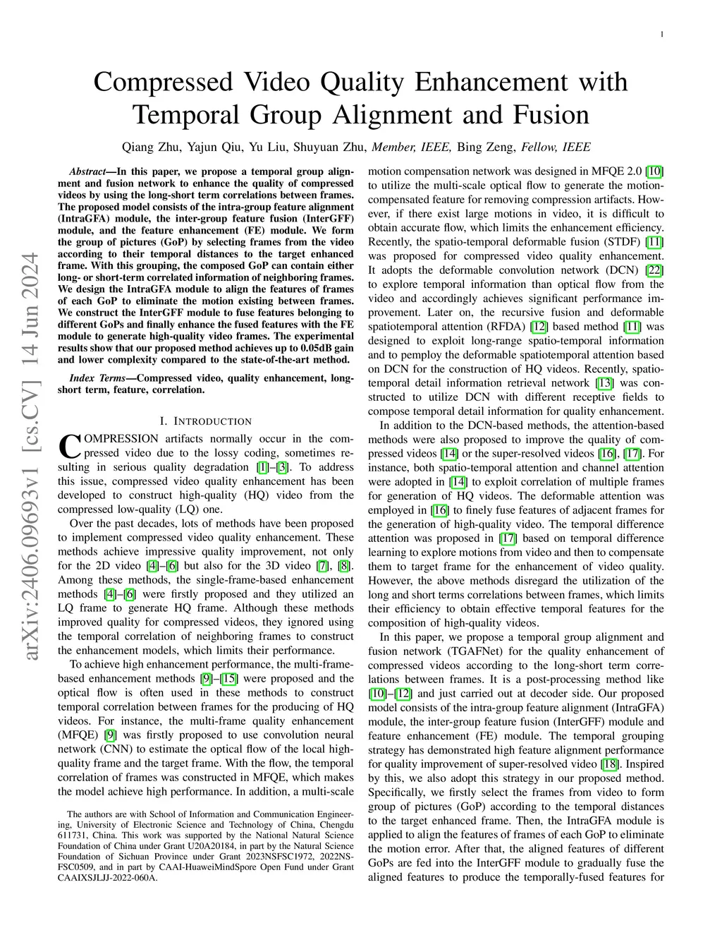 In this paper, we propose a temporal group alignment and fusion network to enhance the quality of compressed videos by using the long-short term correlations between frames. The proposed model consists of the intra-group feature alignment (IntraGFA) module, the inter-group feature fusion (InterGFF) module, and the feature enhancement (FE) module. We form the group of pictures (GoP) by selecting frames from the video according to their temporal distances to the target enhanced frame. With this grouping, the composed GoP can contain either long- or short-term correlated information of neighboring frames. We design the IntraGFA module to align the features of frames of each GoP to eliminate the motion existing between frames. We construct the InterGFF module to fuse features belonging to different GoPs and finally enhance the fused features with the FE module to generate high-quality video frames. The experimental results show that our proposed method achieves up to 0.05dB gain and lower complexity compared to the state-of-the-art method.