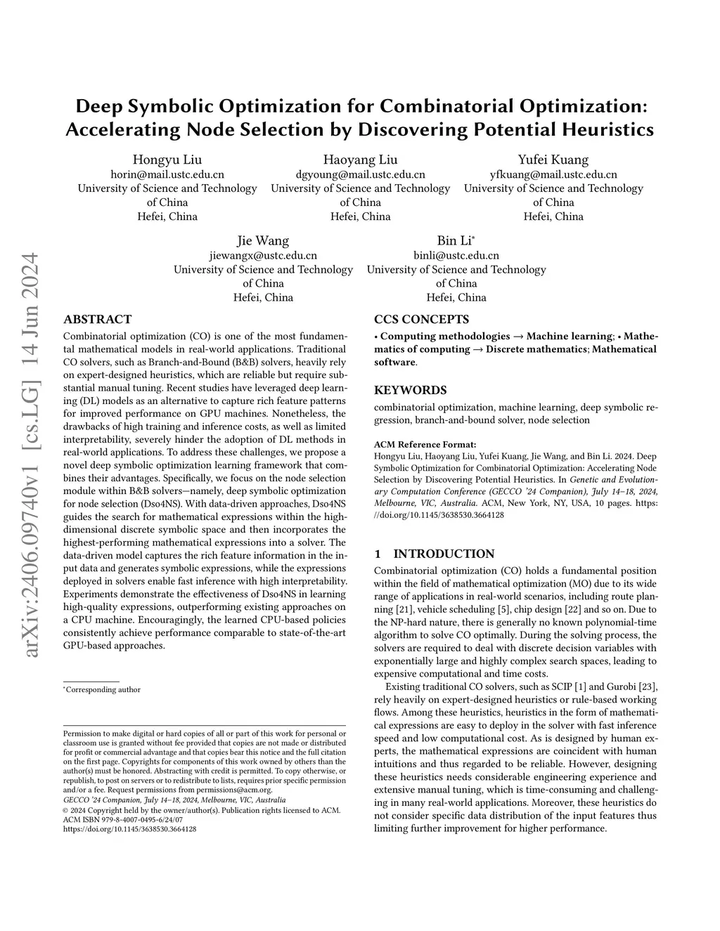 Combinatorial optimization (CO) is one of the most fundamental mathematical models in real-world applications. Traditional CO solvers, such as Branch-and-Bound (B&B) solvers, heavily rely on expert-designed heuristics, which are reliable but require substantial manual tuning. Recent studies have leveraged deep learning (DL) models as an alternative to capture rich feature patterns for improved performance on GPU machines. Nonetheless, the drawbacks of high training and inference costs, as well as limited interpretability, severely hinder the adoption of DL methods in real-world applications. To address these challenges, we propose a novel deep symbolic optimization learning framework that combines their advantages. Specifically, we focus on the node selection module within B&B solvers -- namely, deep symbolic optimization for node selection (Dso4NS). With data-driven approaches, Dso4NS guides the search for mathematical expressions within the high-dimensional discrete symbolic space and then incorporates the highest-performing mathematical expressions into a solver. The data-driven model captures the rich feature information in the input data and generates symbolic expressions, while the expressions deployed in solvers enable fast inference with high interpretability. Experiments demonstrate the effectiveness of Dso4NS in learning high-quality expressions, outperforming existing approaches on a CPU machine. Encouragingly, the learned CPU-based policies consistently achieve performance comparable to state-of-the-art GPU-based approaches.