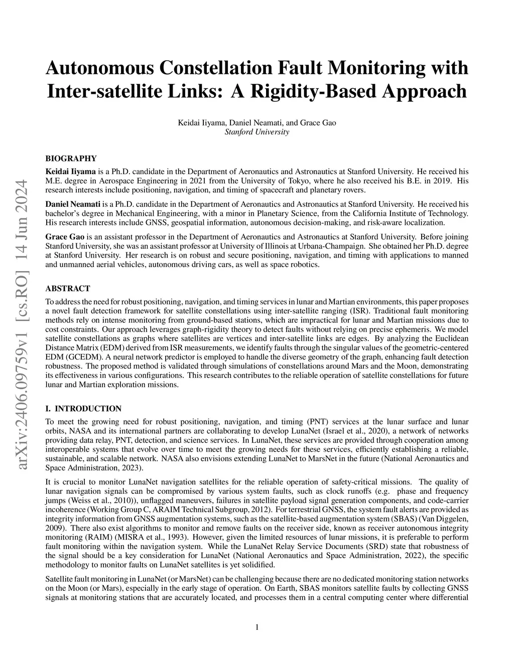 To address the need for robust positioning, navigation, and timing services in lunar and Martian environments, this paper proposes a novel fault detection framework for satellite constellations using inter-satellite ranging (ISR). Traditional fault monitoring methods rely on intense monitoring from ground-based stations, which are impractical for lunar and Martian missions due to cost constraints. Our approach leverages graph-rigidity theory to detect faults without relying on precise ephemeris. We model satellite constellations as graphs where satellites are vertices and inter-satellite links are edges. By analyzing the Euclidean Distance Matrix (EDM) derived from ISR measurements, we identify faults through the singular values of the geometric-centered EDM (GCEDM). A neural network predictor is employed to handle the diverse geometry of the graph, enhancing fault detection robustness. The proposed method is validated through simulations of constellations around Mars and the Moon, demonstrating its effectiveness in various configurations. This research contributes to the reliable operation of satellite constellations for future lunar and Martian exploration missions.