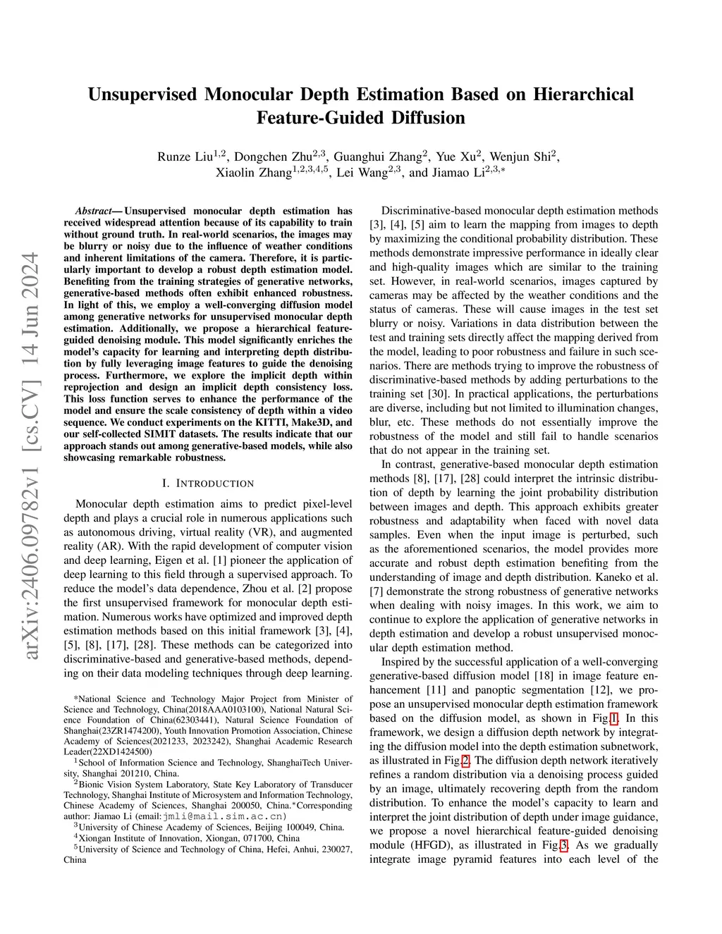 Unsupervised Monocular Depth Estimation Based on Hierarchical Feature-Guided Diffusion