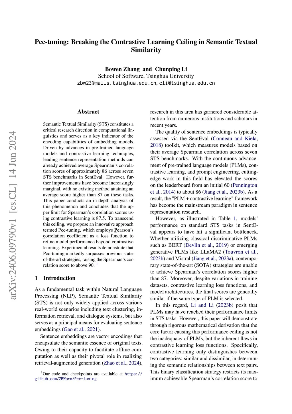 Semantic Textual Similarity (STS) constitutes a critical research direction in computational linguistics and serves as a key indicator of the encoding capabilities of embedding models. Driven by advances in pre-trained language models and contrastive learning techniques, leading sentence representation methods can already achieved average Spearman's correlation scores of approximately 86 across seven STS benchmarks in SentEval. However, further improvements have become increasingly marginal, with no existing method attaining an average score higher than 87 on these tasks. This paper conducts an in-depth analysis of this phenomenon and concludes that the upper limit for Spearman's correlation scores using contrastive learning is 87.5. To transcend this ceiling, we propose an innovative approach termed Pcc-tuning, which employs Pearson's correlation coefficient as a loss function to refine model performance beyond contrastive learning. Experimental results demonstrate that Pcc-tuning markedly surpasses previous state-of-the-art strategies, raising the Spearman's correlation score to above 90.