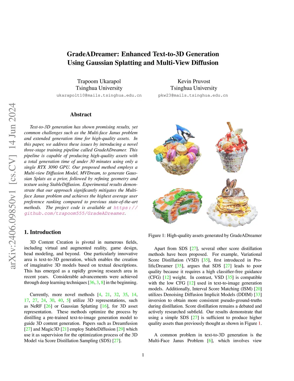 Text-to-3D generation has shown promising results, yet common challenges such as the Multi-face Janus problem and extended generation time for high-quality assets. In this paper, we address these issues by introducing a novel three-stage training pipeline called GradeADreamer. This pipeline is capable of producing high-quality assets with a total generation time of under 30 minutes using only a single RTX 3090 GPU. Our proposed method employs a Multi-view Diffusion Model, MVDream, to generate Gaussian Splats as a prior, followed by refining geometry and texture using StableDiffusion. Experimental results demonstrate that our approach significantly mitigates the Multi-face Janus problem and achieves the highest average user preference ranking compared to previous state-of-the-art methods. The project code is available at https://github.com/trapoom555/GradeADreamer.