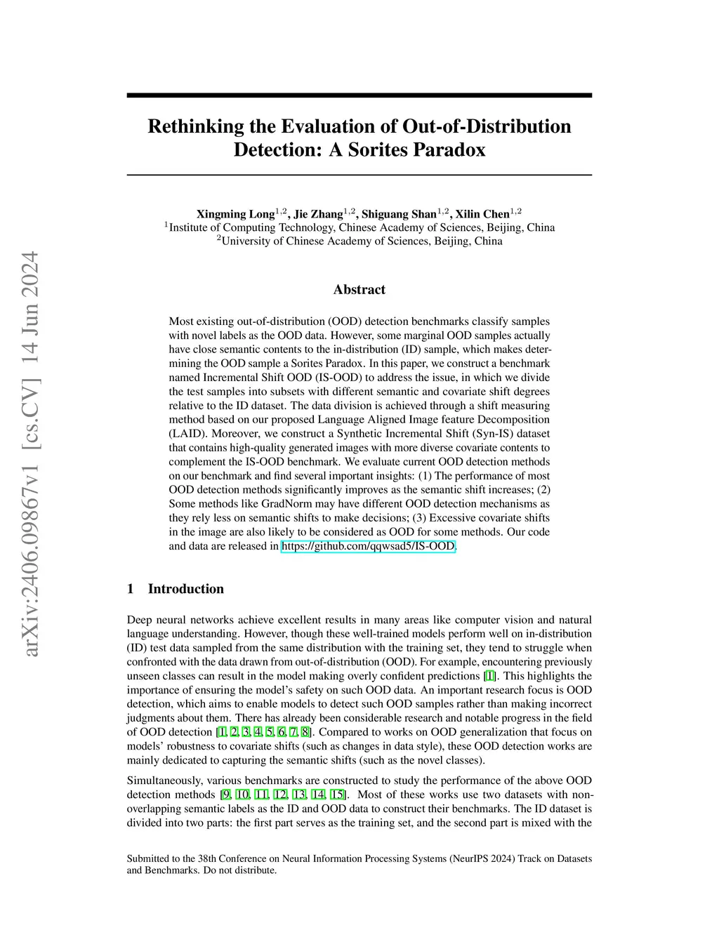 Most existing out-of-distribution (OOD) detection benchmarks classify samples with novel labels as the OOD data. However, some marginal OOD samples actually have close semantic contents to the in-distribution (ID) sample, which makes determining the OOD sample a Sorites Paradox. In this paper, we construct a benchmark named Incremental Shift OOD (IS-OOD) to address the issue, in which we divide the test samples into subsets with different semantic and covariate shift degrees relative to the ID dataset. The data division is achieved through a shift measuring method based on our proposed Language Aligned Image feature Decomposition (LAID). Moreover, we construct a Synthetic Incremental Shift (Syn-IS) dataset that contains high-quality generated images with more diverse covariate contents to complement the IS-OOD benchmark. We evaluate current OOD detection methods on our benchmark and find several important insights: (1) The performance of most OOD detection methods significantly improves as the semantic shift increases; (2) Some methods like GradNorm may have different OOD detection mechanisms as they rely less on semantic shifts to make decisions; (3) Excessive covariate shifts in the image are also likely to be considered as OOD for some methods. Our code and data are released in https://github.com/qqwsad5/IS-OOD.