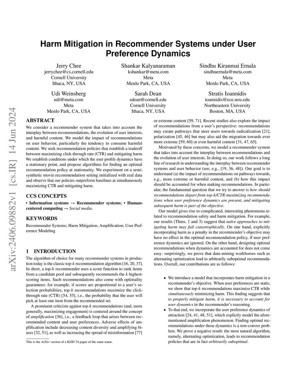 We consider a recommender system that takes into account the interplay between recommendations, the evolution of user interests, and harmful content. We model the impact of recommendations on user behavior, particularly the tendency to consume harmful content. We seek recommendation policies that establish a tradeoff between maximizing click-through rate (CTR) and mitigating harm. We establish conditions under which the user profile dynamics have a stationary point, and propose algorithms for finding an optimal recommendation policy at stationarity. We experiment on a semi-synthetic movie recommendation setting initialized with real data and observe that our policies outperform baselines at simultaneously maximizing CTR and mitigating harm.