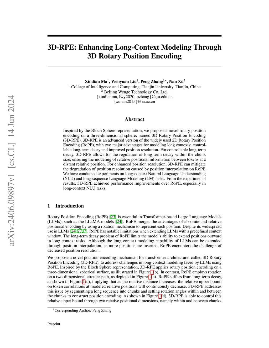 Inspired by the Bloch Sphere representation, we propose a novel rotary position encoding on a three-dimensional sphere, named 3D Rotary Position Encoding (3D-RPE). 3D-RPE is an advanced version of the widely used 2D Rotary Position Encoding (RoPE), with two major advantages for modeling long contexts: controllable long-term decay and improved position resolution. For controllable long-term decay, 3D-RPE allows for the regulation of long-term decay within the chunk size, ensuring the modeling of relative positional information between tokens at a distant relative position. For enhanced position resolution, 3D-RPE can mitigate the degradation of position resolution caused by position interpolation on RoPE. We have conducted experiments on long-context Natural Language Understanding (NLU) and long-sequence Language Modeling (LM) tasks. From the experimental results, 3D-RPE achieved performance improvements over RoPE, especially in long-context NLU tasks.
