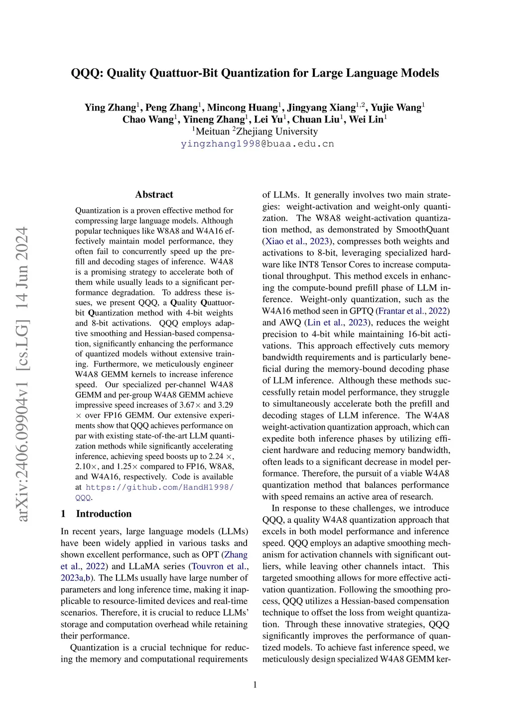 Quantization is a proven effective method for compressing large language models. Although popular techniques like W8A8 and W4A16 effectively maintain model performance, they often fail to concurrently speed up the prefill and decoding stages of inference. W4A8 is a promising strategy to accelerate both of them while usually leads to a significant performance degradation. To address these issues, we present QQQ, a Quality Quattuor-bit Quantization method with 4-bit weights and 8-bit activations. QQQ employs adaptive smoothing and Hessian-based compensation, significantly enhancing the performance of quantized models without extensive training. Furthermore, we meticulously engineer W4A8 GEMM kernels to increase inference speed. Our specialized per-channel W4A8 GEMM and per-group W4A8 GEMM achieve impressive speed increases of 3.67 and 3.29 over FP16 GEMM. Our extensive experiments show that QQQ achieves performance on par with existing state-of-the-art LLM quantization methods while significantly accelerating inference, achieving speed boosts up to 2.24 , 2.10, and 1.25 compared to FP16, W8A8, and W4A16, respectively.