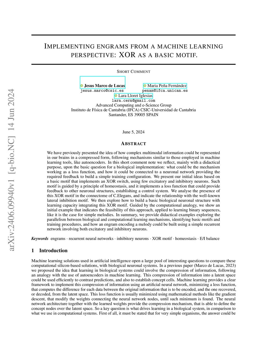 We have previously presented the idea of how complex multimodal information could be represented in our brains in a compressed form, following mechanisms similar to those employed in machine learning tools, like autoencoders. In this short comment note we reflect, mainly with a didactical purpose, upon the basic question for a biological implementation: what could be the mechanism working as a loss function, and how it could be connected to a neuronal network providing the required feedback to build a simple training configuration. We present our initial ideas based on a basic motif that implements an XOR switch, using few excitatory and inhibitory neurons. Such motif is guided by a principle of homeostasis, and it implements a loss function that could provide feedback to other neuronal structures, establishing a control system. We analyse the presence of this XOR motif in the connectome of C.Elegans, and indicate the relationship with the well-known lateral inhibition motif. We then explore how to build a basic biological neuronal structure with learning capacity integrating this XOR motif. Guided by the computational analogy, we show an initial example that indicates the feasibility of this approach, applied to learning binary sequences, like it is the case for simple melodies. In summary, we provide didactical examples exploring the parallelism between biological and computational learning mechanisms, identifying basic motifs and training procedures, and how an engram encoding a melody could be built using a simple recurrent network involving both excitatory and inhibitory neurons.