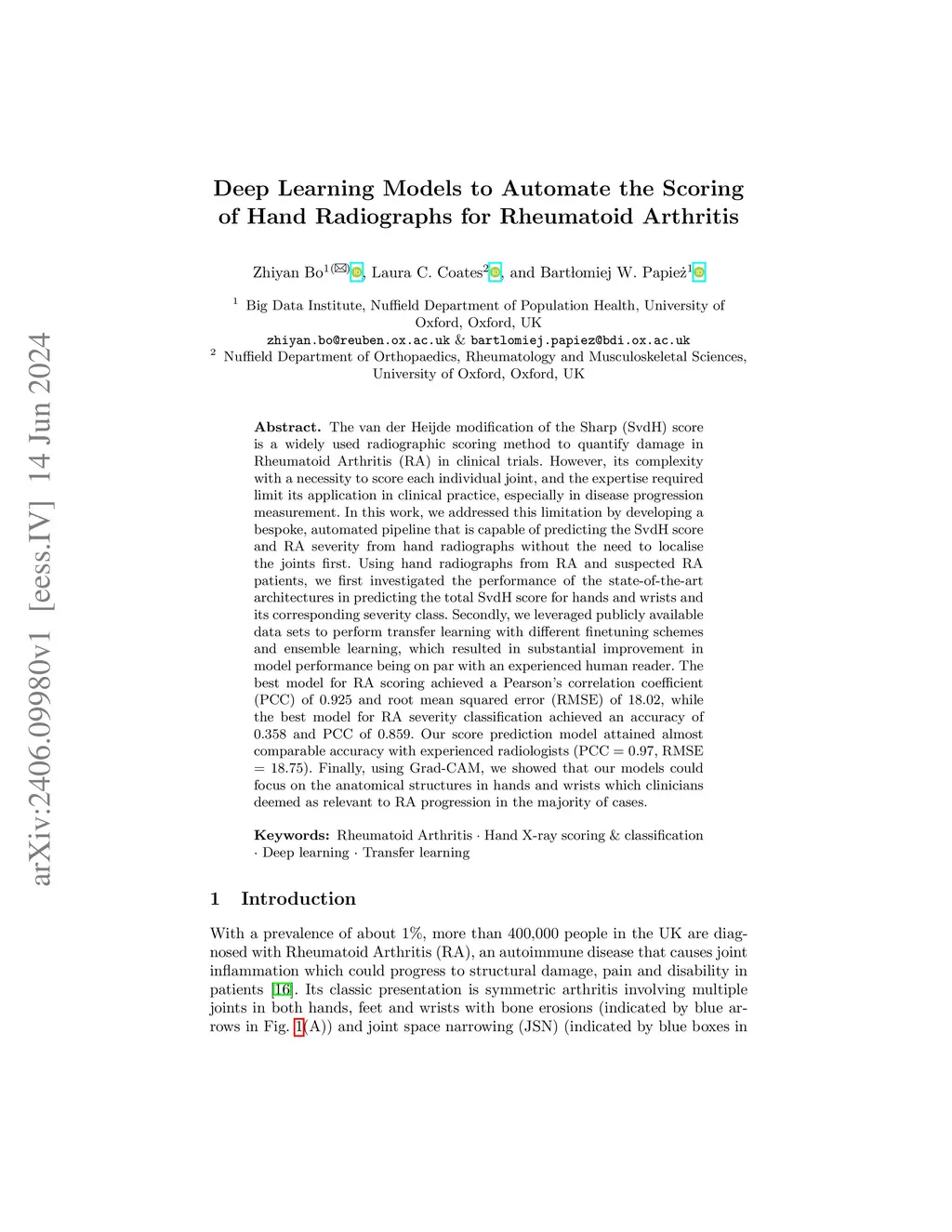 The van der Heijde modification of the Sharp (SvdH) score is a widely used radiographic scoring method to quantify damage in Rheumatoid Arthritis (RA) in clinical trials. However, its complexity with a necessity to score each individual joint, and the expertise required limit its application in clinical practice, especially in disease progression measurement. In this work, we addressed this limitation by developing a bespoke, automated pipeline that is capable of predicting the SvdH score and RA severity from hand radiographs without the need to localise the joints first. Using hand radiographs from RA and suspected RA patients, we first investigated the performance of the state-of-the-art architectures in predicting the total SvdH score for hands and wrists and its corresponding severity class. Secondly, we leveraged publicly available data sets to perform transfer learning with different finetuning schemes and ensemble learning, which resulted in substantial improvement in model performance being on par with an experienced human reader. The best model for RA scoring achieved a Pearson's correlation coefficient (PCC) of 0.925 and root mean squared error (RMSE) of 18.02, while the best model for RA severity classification achieved an accuracy of 0.358 and PCC of 0.859. Our score prediction model attained almost comparable accuracy with experienced radiologists (PCC = 0.97, RMSE = 18.75). Finally, using Grad-CAM, we showed that our models could focus on the anatomical structures in hands and wrists which clinicians deemed as relevant to RA progression in the majority of cases.