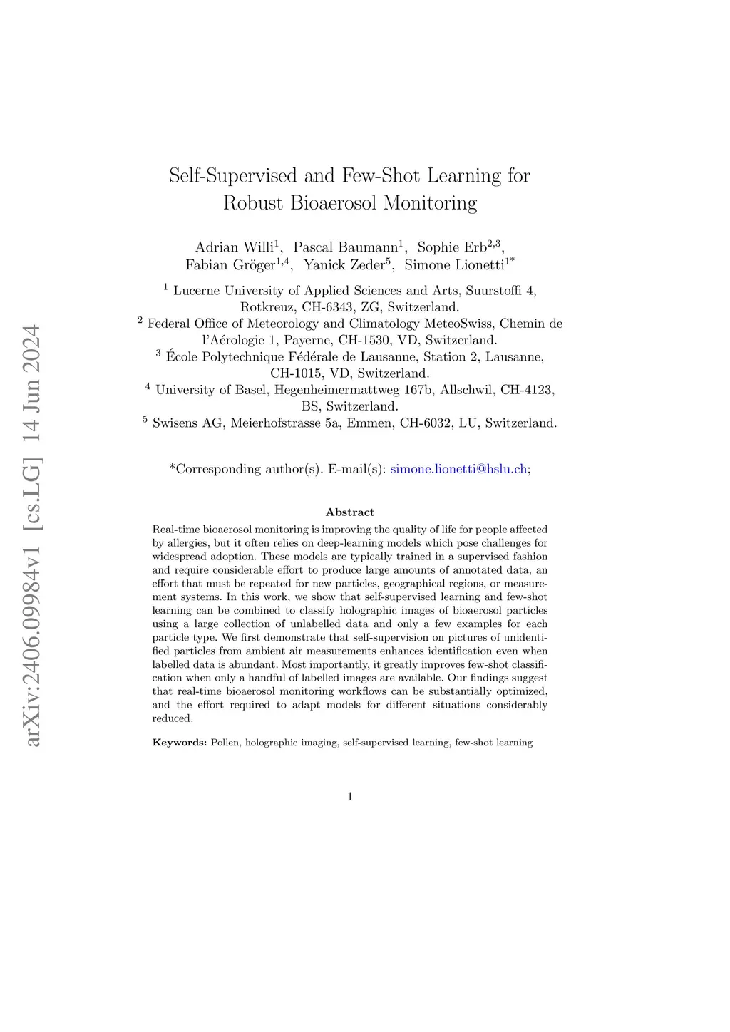 Real-time bioaerosol monitoring is improving the quality of life for people affected by allergies, but it often relies on deep-learning models which pose challenges for widespread adoption. These models are typically trained in a supervised fashion and require considerable effort to produce large amounts of annotated data, an effort that must be repeated for new particles, geographical regions, or measurement systems. In this work, we show that self-supervised learning and few-shot learning can be combined to classify holographic images of bioaerosol particles using a large collection of unlabelled data and only a few examples for each particle type. We first demonstrate that self-supervision on pictures of unidentified particles from ambient air measurements enhances identification even when labelled data is abundant. Most importantly, it greatly improves few-shot classification when only a handful of labelled images are available. Our findings suggest that real-time bioaerosol monitoring workflows can be substantially optimized, and the effort required to adapt models for different situations considerably reduced.