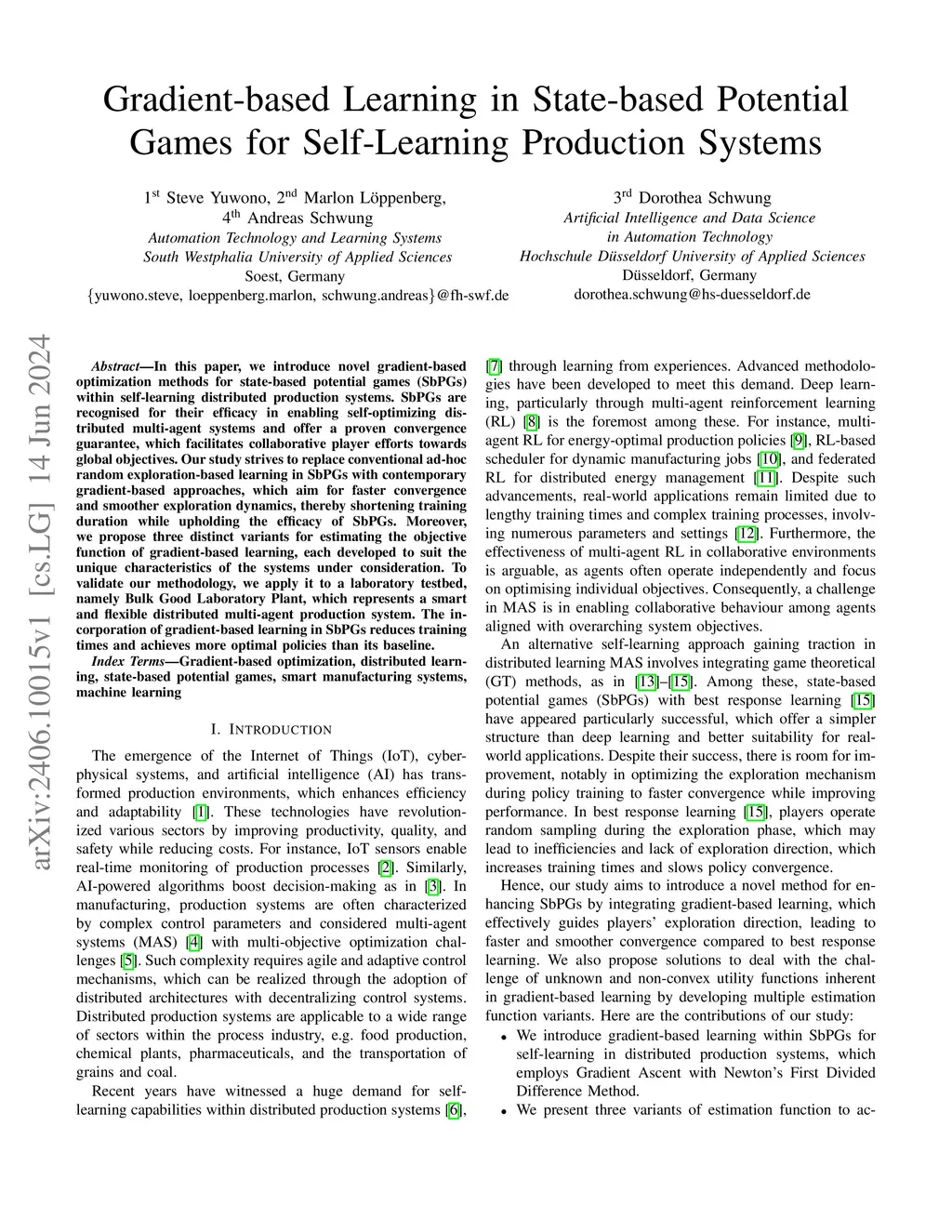 In this paper, we introduce novel gradient-based optimization methods for state-based potential games (SbPGs) within self-learning distributed production systems. SbPGs are recognised for their efficacy in enabling self-optimizing distributed multi-agent systems and offer a proven convergence guarantee, which facilitates collaborative player efforts towards global objectives. Our study strives to replace conventional ad-hoc random exploration-based learning in SbPGs with contemporary gradient-based approaches, which aim for faster convergence and smoother exploration dynamics, thereby shortening training duration while upholding the efficacy of SbPGs. Moreover, we propose three distinct variants for estimating the objective function of gradient-based learning, each developed to suit the unique characteristics of the systems under consideration. To validate our methodology, we apply it to a laboratory testbed, namely Bulk Good Laboratory Plant, which represents a smart and flexible distributed multi-agent production system. The incorporation of gradient-based learning in SbPGs reduces training times and achieves more optimal policies than its baseline.