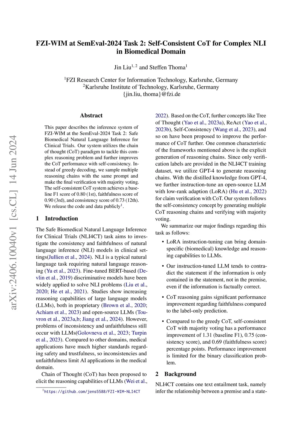 This paper describes the inference system of FZI-WIM at the SemEval-2024 Task 2: Safe Biomedical Natural Language Inference for Clinical Trials. Our system utilizes the chain of thought (CoT) paradigm to tackle this complex reasoning problem and further improves the CoT performance with self-consistency. Instead of greedy decoding, we sample multiple reasoning chains with the same prompt and make the final verification with majority voting. The self-consistent CoT system achieves a baseline F1 score of 0.80 (1st), faithfulness score of 0.90 (3rd), and consistency score of 0.73 (12th). We release the code and data publicly https://github.com/jens5588/FZI-WIM-NLI4CT.