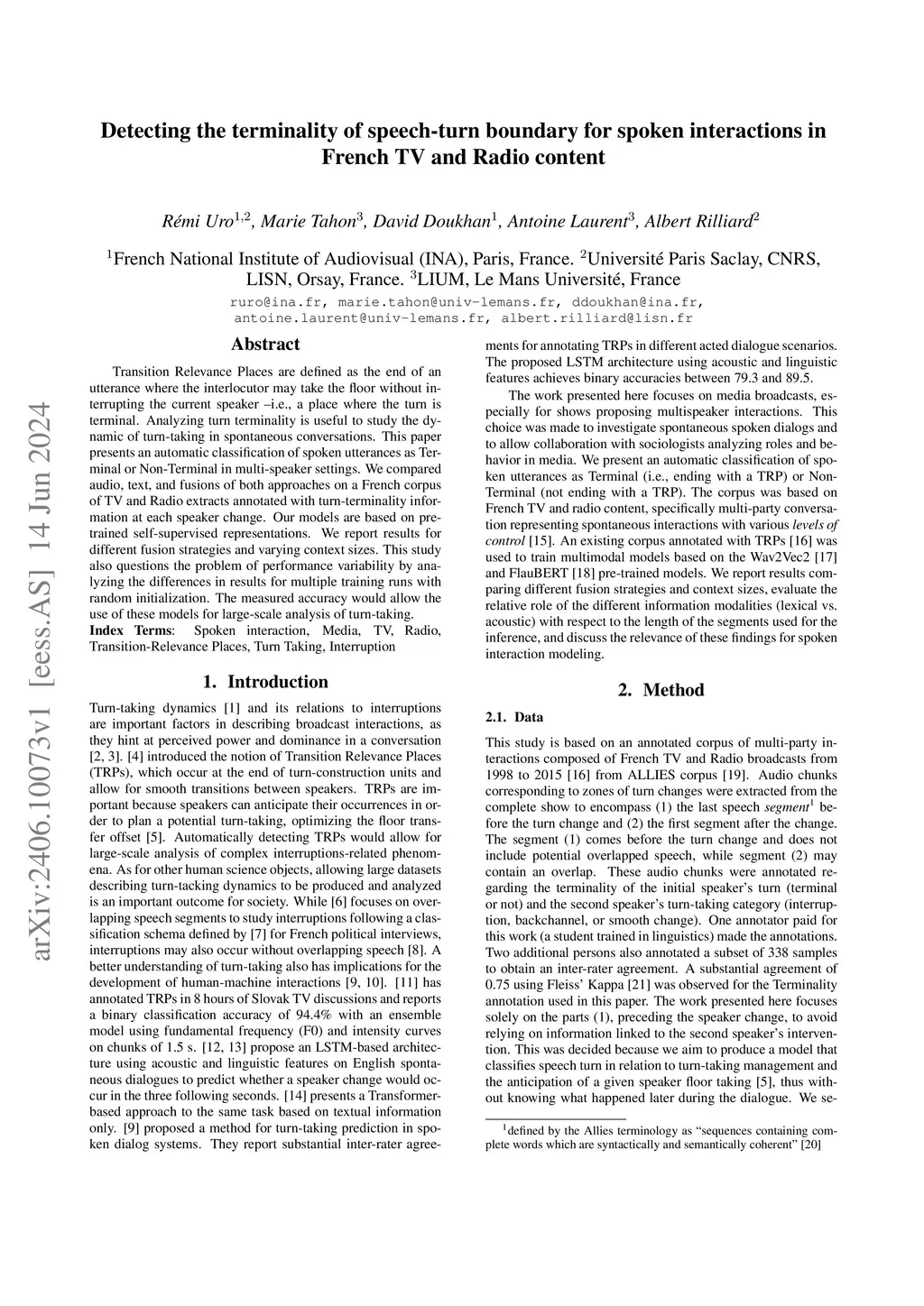 Transition Relevance Places are defined as the end of an utterance where the interlocutor may take the floor without interrupting the current speaker --i.e., a place where the turn is terminal. Analyzing turn terminality is useful to study the dynamic of turn-taking in spontaneous conversations. This paper presents an automatic classification of spoken utterances as Terminal or Non-Terminal in multi-speaker settings. We compared audio, text, and fusions of both approaches on a French corpus of TV and Radio extracts annotated with turn-terminality information at each speaker change. Our models are based on pre-trained self-supervised representations. We report results for different fusion strategies and varying context sizes. This study also questions the problem of performance variability by analyzing the differences in results for multiple training runs with random initialization. The measured accuracy would allow the use of these models for large-scale analysis of turn-taking.