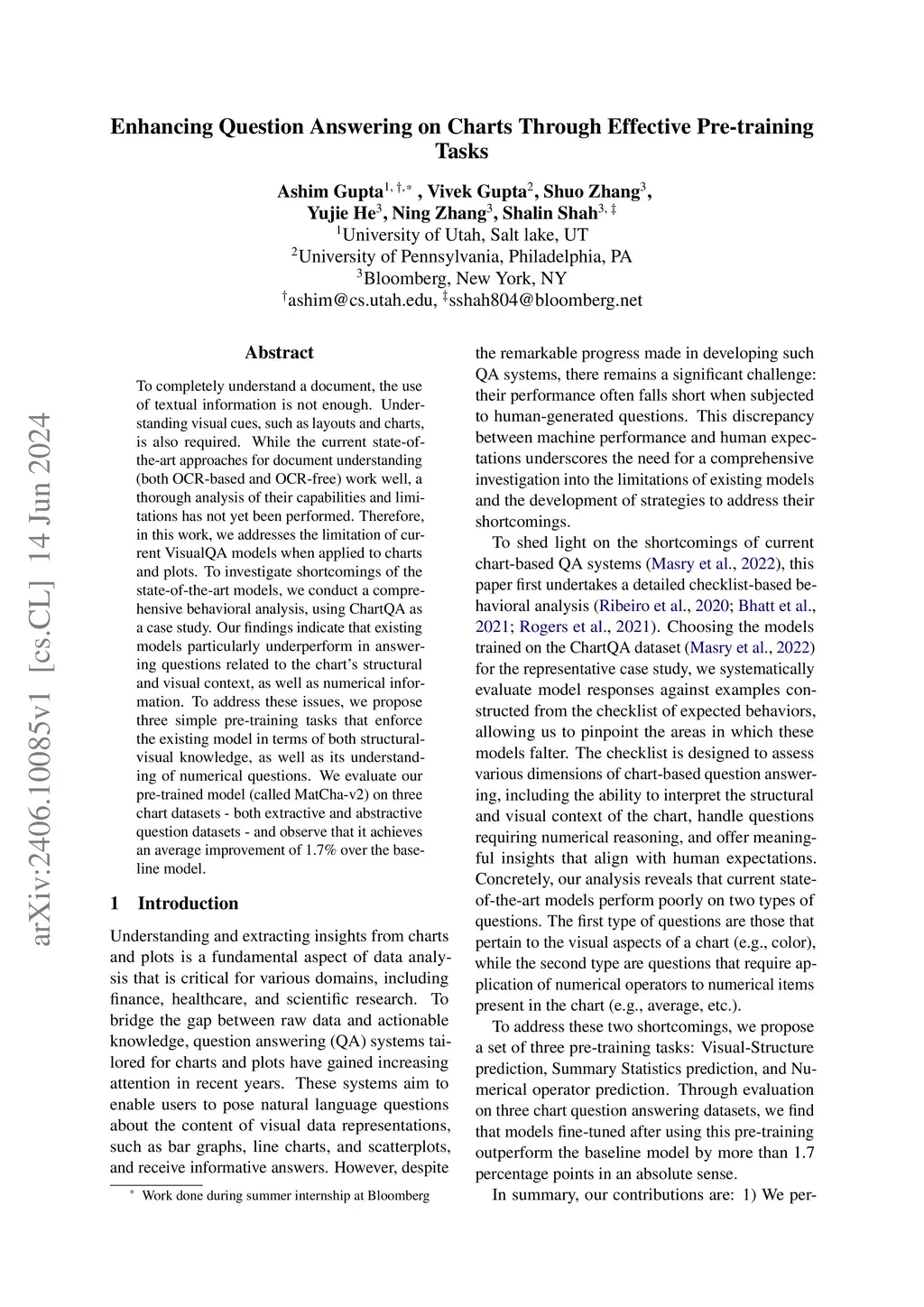 To completely understand a document, the use of textual information is not enough. Understanding visual cues, such as layouts and charts, is also required. While the current state-of-the-art approaches for document understanding (both OCR-based and OCR-free) work well, a thorough analysis of their capabilities and limitations has not yet been performed. Therefore, in this work, we addresses the limitation of current VisualQA models when applied to charts and plots. To investigate shortcomings of the state-of-the-art models, we conduct a comprehensive behavioral analysis, using ChartQA as a case study. Our findings indicate that existing models particularly underperform in answering questions related to the chart's structural and visual context, as well as numerical information. To address these issues, we propose three simple pre-training tasks that enforce the existing model in terms of both structural-visual knowledge, as well as its understanding of numerical questions. We evaluate our pre-trained model (called MatCha-v2) on three chart datasets - both extractive and abstractive question datasets - and observe that it achieves an average improvement of 1.7% over the baseline model.
