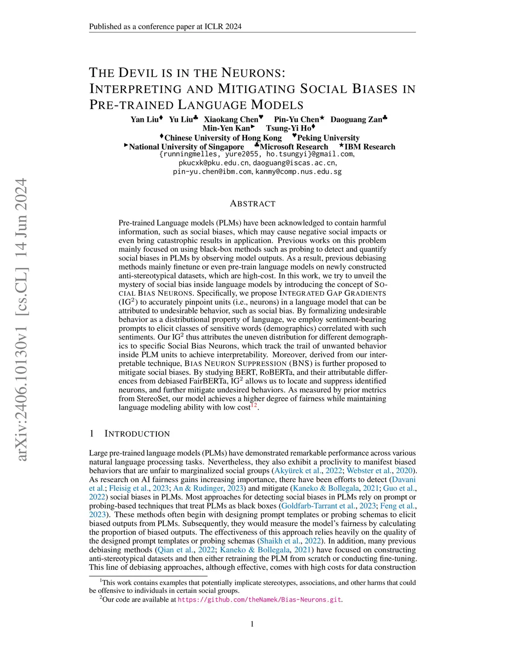 Pre-trained Language models (PLMs) have been acknowledged to contain harmful information, such as social biases, which may cause negative social impacts or even bring catastrophic results in application. Previous works on this problem mainly focused on using black-box methods such as probing to detect and quantify social biases in PLMs by observing model outputs. As a result, previous debiasing methods mainly finetune or even pre-train language models on newly constructed anti-stereotypical datasets, which are high-cost. In this work, we try to unveil the mystery of social bias inside language models by introducing the concept of {\sc Social Bias Neurons}. Specifically, we propose {\sc Integrated Gap Gradients (IG)} to accurately pinpoint units (i.e., neurons) in a language model that can be attributed to undesirable behavior, such as social bias. By formalizing undesirable behavior as a distributional property of language, we employ sentiment-bearing prompts to elicit classes of sensitive words (demographics) correlated with such sentiments. Our IG thus attributes the uneven distribution for different demographics to specific Social Bias Neurons, which track the trail of unwanted behavior inside PLM units to achieve interoperability. Moreover, derived from our interpretable technique, {\sc Bias Neuron Suppression (BNS)} is further proposed to mitigate social biases. By studying BERT, RoBERTa, and their attributable differences from debiased FairBERTa, IG allows us to locate and suppress identified neurons, and further mitigate undesired behaviors. As measured by prior metrics from StereoSet, our model achieves a higher degree of fairness while maintaining language modeling ability with low cost.