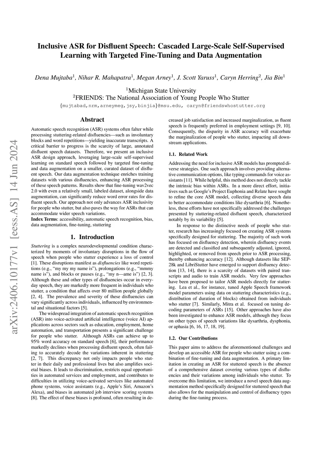 Automatic speech recognition (ASR) systems often falter while processing stuttering-related disfluencies -- such as involuntary blocks and word repetitions -- yielding inaccurate transcripts. A critical barrier to progress is the scarcity of large, annotated disfluent speech datasets. Therefore, we present an inclusive ASR design approach, leveraging large-scale self-supervised learning on standard speech followed by targeted fine-tuning and data augmentation on a smaller, curated dataset of disfluent speech. Our data augmentation technique enriches training datasets with various disfluencies, enhancing ASR processing of these speech patterns. Results show that fine-tuning wav2vec 2.0 with even a relatively small, labeled dataset, alongside data augmentation, can significantly reduce word error rates for disfluent speech. Our approach not only advances ASR inclusivity for people who stutter, but also paves the way for ASRs that can accommodate wider speech variations.