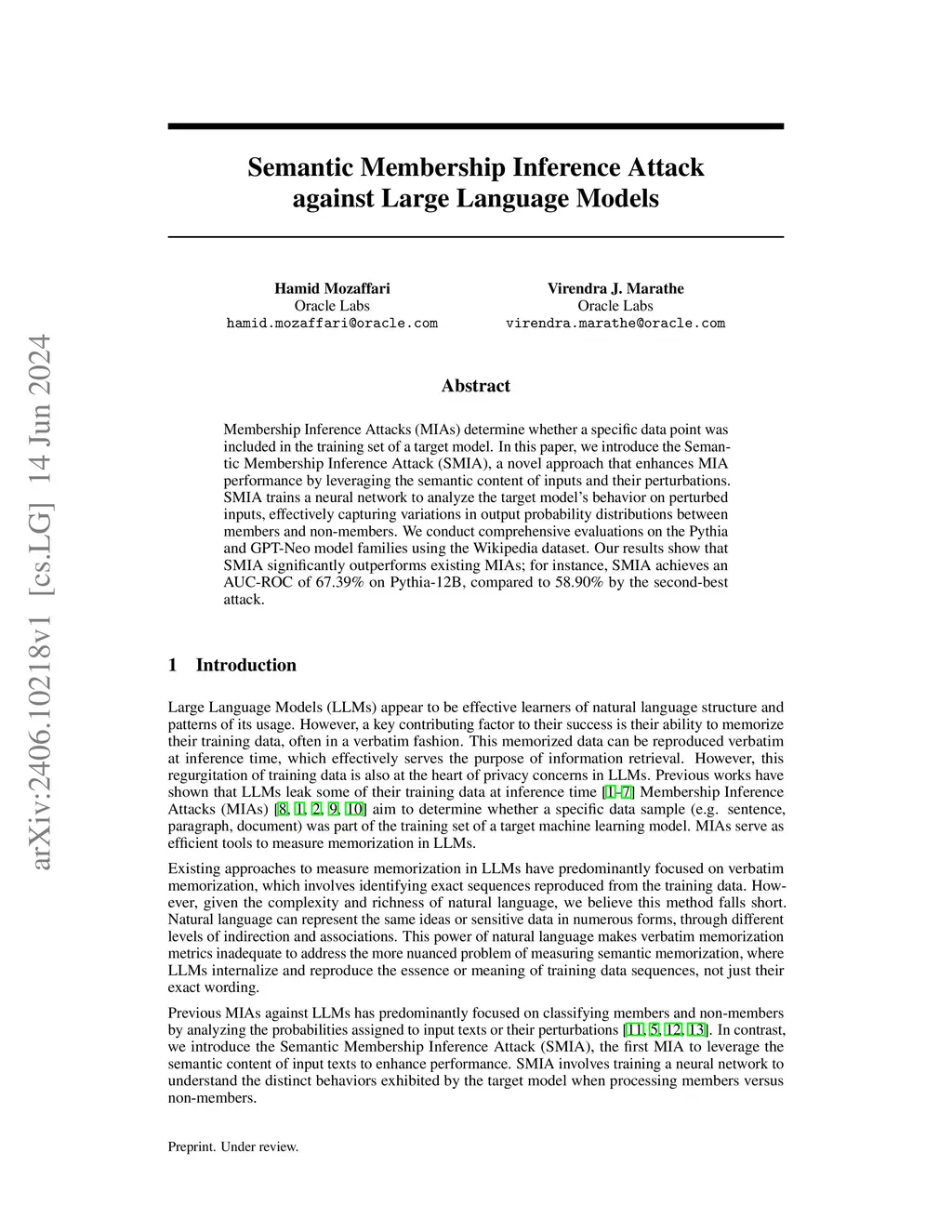 Membership Inference Attacks (MIAs) determine whether a specific data point was included in the training set of a target model. In this paper, we introduce the Semantic Membership Inference Attack (SMIA), a novel approach that enhances MIA performance by leveraging the semantic content of inputs and their perturbations. SMIA trains a neural network to analyze the target model's behavior on perturbed inputs, effectively capturing variations in output probability distributions between members and non-members. We conduct comprehensive evaluations on the Pythia and GPT-Neo model families using the Wikipedia dataset. Our results show that SMIA significantly outperforms existing MIAs; for instance, SMIA achieves an AUC-ROC of 67.39% on Pythia-12B, compared to 58.90% by the second-best attack.