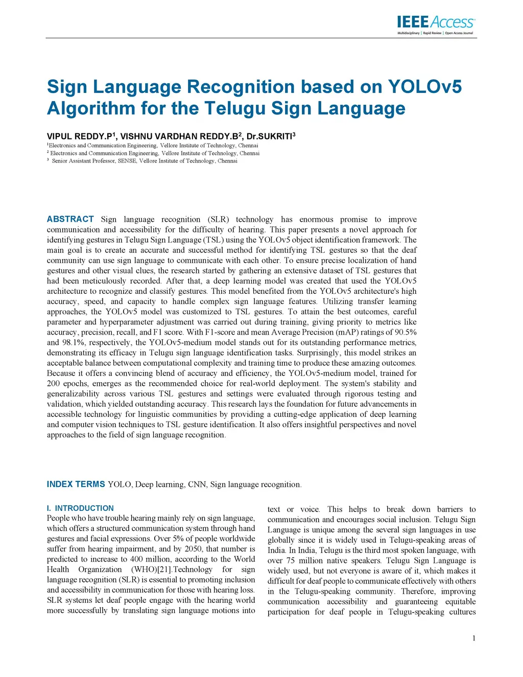 Sign Language Recognition based on YOLOv5 Algorithm for the Telugu Sign