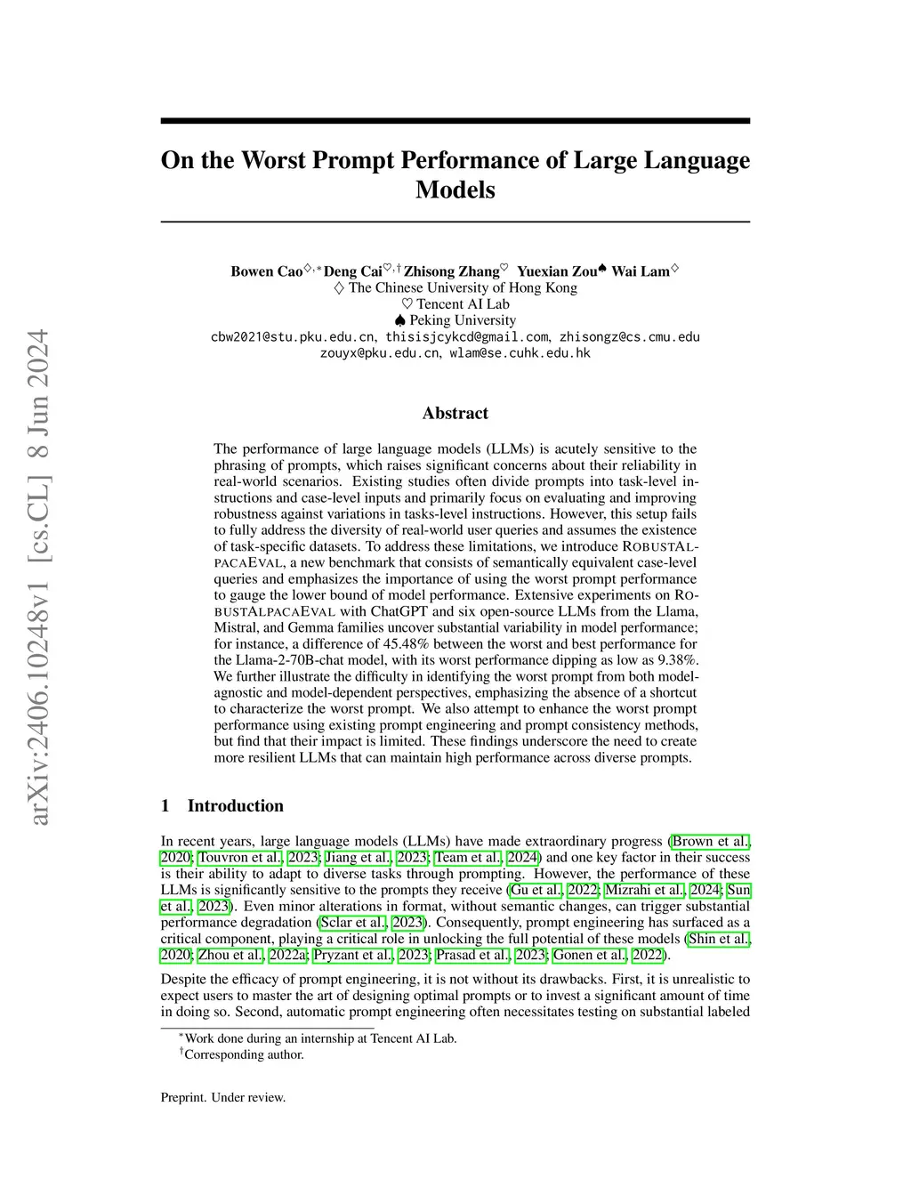 The performance of large language models (LLMs) is acutely sensitive to the phrasing of prompts, which raises significant concerns about their reliability in real-world scenarios. Existing studies often divide prompts into task-level instructions and case-level inputs and primarily focus on evaluating and improving robustness against variations in tasks-level instructions. However, this setup fails to fully address the diversity of real-world user queries and assumes the existence of task-specific datasets. To address these limitations, we introduce RobustAlpacaEval, a new benchmark that consists of semantically equivalent case-level queries and emphasizes the importance of using the worst prompt performance to gauge the lower bound of model performance. Extensive experiments on RobustAlpacaEval with ChatGPT and six open-source LLMs from the Llama, Mistral, and Gemma families uncover substantial variability in model performance; for instance, a difference of 45.48% between the worst and best performance for the Llama-2-70B-chat model, with its worst performance dipping as low as 9.38%. We further illustrate the difficulty in identifying the worst prompt from both model-agnostic and model-dependent perspectives, emphasizing the absence of a shortcut to characterize the worst prompt. We also attempt to enhance the worst prompt performance using existing prompt engineering and prompt consistency methods, but find that their impact is limited. These findings underscore the need to create more resilient LLMs that can maintain high performance across diverse prompts. Data and code are available at https://github.com/cbwbuaa/On-the-Worst-Prompt- Performance-of-LLMs.