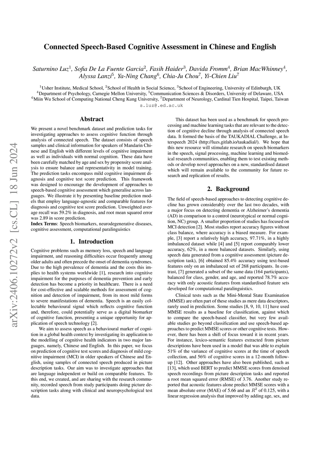 We present a novel benchmark dataset and prediction tasks for investigating approaches to assess cognitive function through analysis of connected speech. The dataset consists of speech samples and clinical information for speakers of Mandarin Chinese and English with different levels of cognitive impairment as well as individuals with normal cognition. These data have been carefully matched by age and sex by propensity score analysis to ensure balance and representativity in model training. The prediction tasks encompass mild cognitive impairment diagnosis and cognitive test score prediction. This framework was designed to encourage the development of approaches to speech-based cognitive assessment which generalise across languages. We illustrate it by presenting baseline prediction models that employ language-agnostic and comparable features for diagnosis and cognitive test score prediction. The models achieved unweighted average recall was 59.2% in diagnosis, and root mean squared error of 2.89 in score prediction.