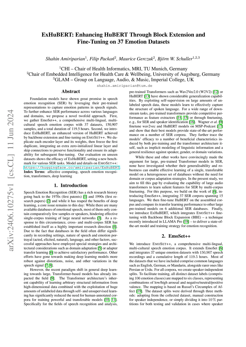 ExHuBERT: Enhancing HuBERT Through Block Extension and Fine-Tuning on 37