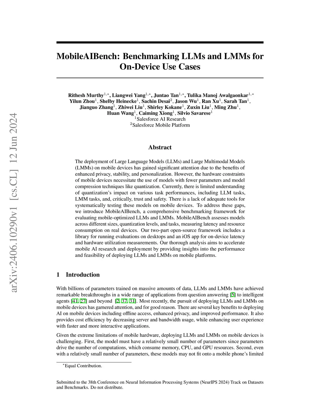 The deployment of Large Language Models (LLMs) and Large Multimodal Models (LMMs) on mobile devices has gained significant attention due to the benefits of enhanced privacy, stability, and personalization. However, the hardware constraints of mobile devices necessitate the use of models with fewer parameters and model compression techniques like quantization. Currently, there is limited understanding of quantization's impact on various task performances, including LLM tasks, LMM tasks, and, critically, trust and safety. There is a lack of adequate tools for systematically testing these models on mobile devices. To address these gaps, we introduce MobileAIBench, a comprehensive benchmarking framework for evaluating mobile-optimized LLMs and LMMs. MobileAIBench assesses models across different sizes, quantization levels, and tasks, measuring latency and resource consumption on real devices. Our two-part open-source framework includes a library for running evaluations on desktops and an iOS app for on-device latency and hardware utilization measurements. Our thorough analysis aims to accelerate mobile AI research and deployment by providing insights into the performance and feasibility of deploying LLMs and LMMs on mobile platforms.