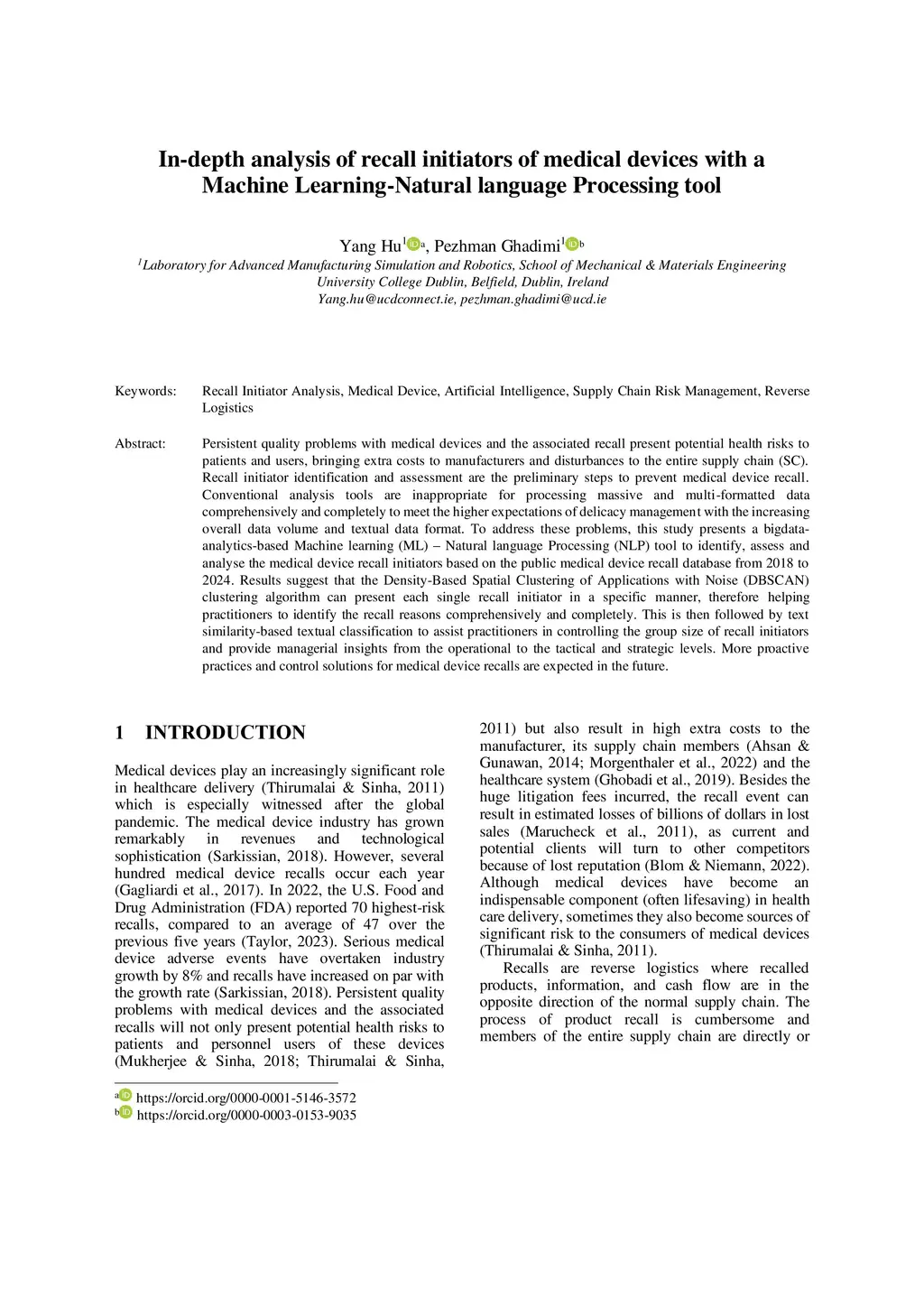 Recall initiator identification and assessment are the preliminary steps to prevent medical device recall. Conventional analysis tools are inappropriate for processing massive and multi-formatted data comprehensively and completely to meet the higher expectations of delicacy management with the increasing overall data volume and textual data format. This study presents a bigdata-analytics-based machine learning-natural language processing work tool to address the shortcomings in dealing efficiency and data process versatility of conventional tools in the practical context of big data volume and muti data format. This study identified, assessed and analysed the medical device recall initiators according to the public medical device recall database from 2018 to 2024 with the ML-NLP tool. The results suggest that the unsupervised Density-Based Spatial Clustering of Applications with Noise (DBSCAN) clustering algorithm can present each single recall initiator in a specific manner, therefore helping practitioners to identify the recall reasons comprehensively and completely within a short time frame. This is then followed by text similarity-based textual classification to assist practitioners in controlling the group size of recall initiators and provide managerial insights from the operational to the tactical and strategical levels. This ML-NLP work tool can not only capture specific details of each recall initiator but also interpret the inner connection of each existing initiator and can be implemented for risk identification and assessment in the forward SC. Finally, this paper suggests some concluding remarks and presents future works. More proactive practices and control solutions for medical device recalls are expected in the future.