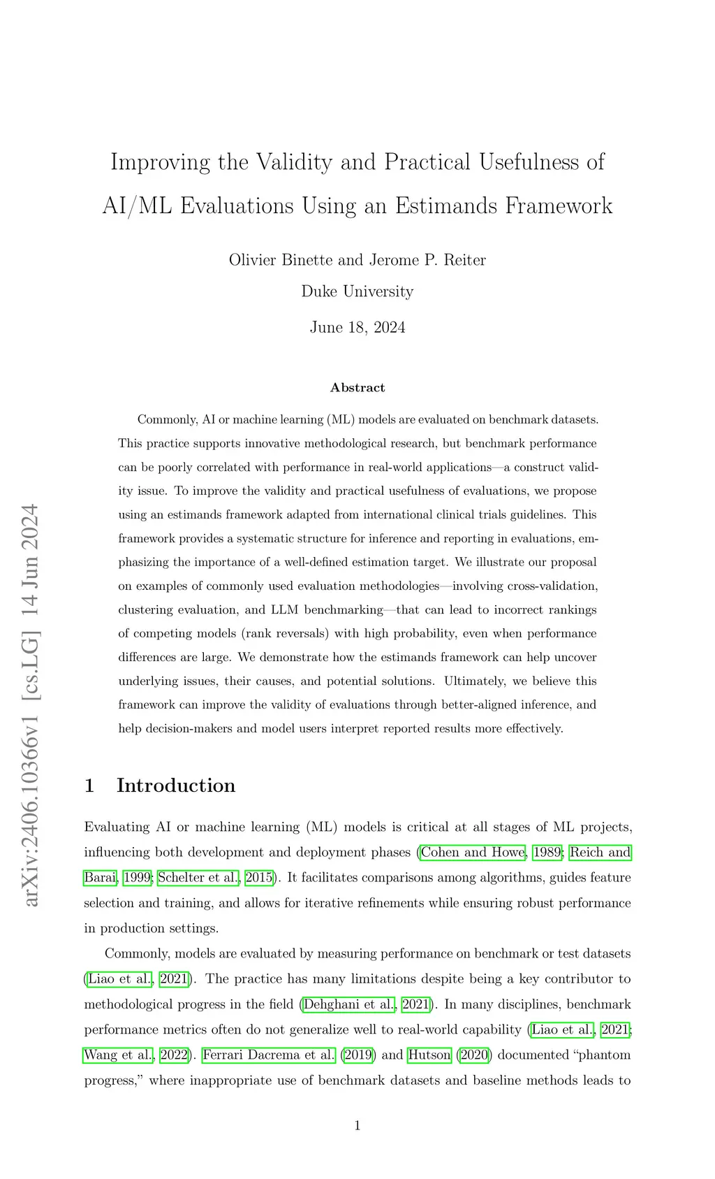 Commonly, AI or machine learning (ML) models are evaluated on benchmark datasets. This practice supports innovative methodological research, but benchmark performance can be poorly correlated with performance in real-world applications -- a construct validity issue. To improve the validity and practical usefulness of evaluations, we propose using an estimands framework adapted from international clinical trials guidelines. This framework provides a systematic structure for inference and reporting in evaluations, emphasizing the importance of a well-defined estimation target. We illustrate our proposal on examples of commonly used evaluation methodologies - involving cross-validation, clustering evaluation, and LLM benchmarking - that can lead to incorrect rankings of competing models (rank reversals) with high probability, even when performance differences are large. We demonstrate how the estimands framework can help uncover underlying issues, their causes, and potential solutions. Ultimately, we believe this framework can improve the validity of evaluations through better-aligned inference, and help decision-makers and model users interpret reported results more effectively.