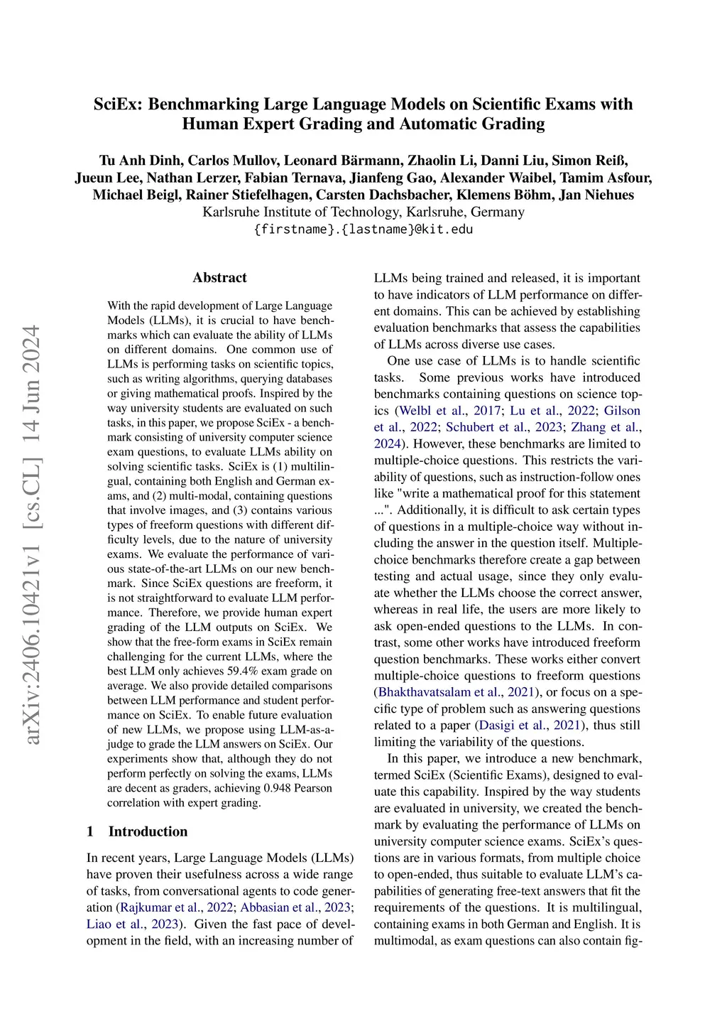 With the rapid development of Large Language Models (LLMs), it is crucial to have benchmarks which can evaluate the ability of LLMs on different domains. One common use of LLMs is performing tasks on scientific topics, such as writing algorithms, querying databases or giving mathematical proofs. Inspired by the way university students are evaluated on such tasks, in this paper, we propose SciEx - a benchmark consisting of university computer science exam questions, to evaluate LLMs ability on solving scientific tasks. SciEx is (1) multilingual, containing both English and German exams, and (2) multi-modal, containing questions that involve images, and (3) contains various types of freeform questions with different difficulty levels, due to the nature of university exams. We evaluate the performance of various state-of-the-art LLMs on our new benchmark. Since SciEx questions are freeform, it is not straightforward to evaluate LLM performance. Therefore, we provide human expert grading of the LLM outputs on SciEx. We show that the free-form exams in SciEx remain challenging for the current LLMs, where the best LLM only achieves 59.4\% exam grade on average. We also provide detailed comparisons between LLM performance and student performance on SciEx. To enable future evaluation of new LLMs, we propose using LLM-as-a-judge to grade the LLM answers on SciEx. Our experiments show that, although they do not perform perfectly on solving the exams, LLMs are decent as graders, achieving 0.948 Pearson correlation with expert grading.