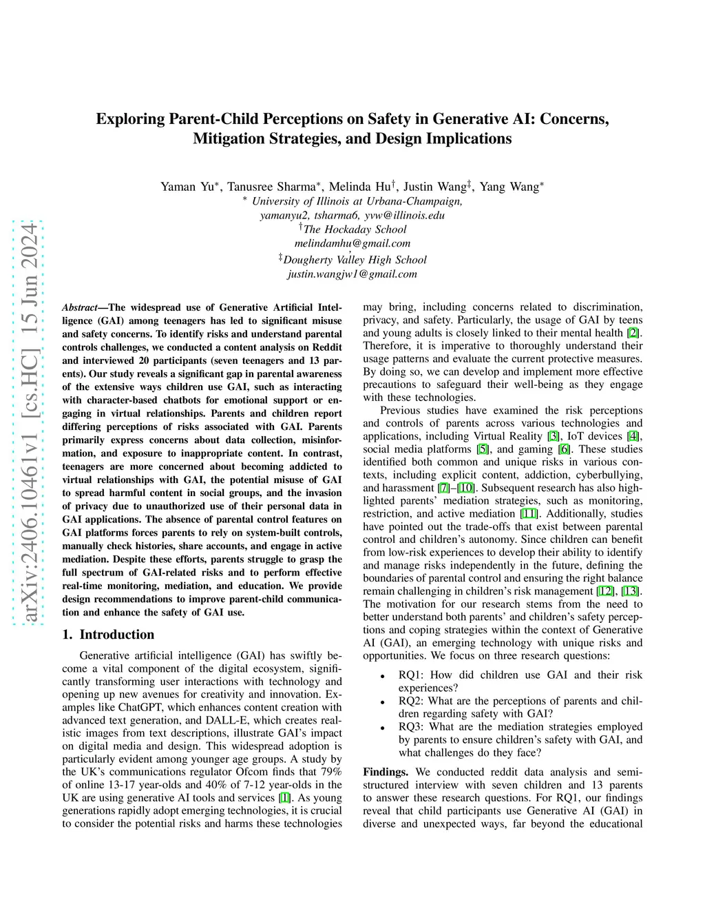 The widespread use of Generative Artificial Intelligence (GAI) among teenagers has led to significant misuse and safety concerns. To identify risks and understand parental controls challenges, we conducted a content analysis on Reddit and interviewed 20 participants (seven teenagers and 13 parents). Our study reveals a significant gap in parental awareness of the extensive ways children use GAI, such as interacting with character-based chatbots for emotional support or engaging in virtual relationships. Parents and children report differing perceptions of risks associated with GAI. Parents primarily express concerns about data collection, misinformation, and exposure to inappropriate content. In contrast, teenagers are more concerned about becoming addicted to virtual relationships with GAI, the potential misuse of GAI to spread harmful content in social groups, and the invasion of privacy due to unauthorized use of their personal data in GAI applications. The absence of parental control features on GAI platforms forces parents to rely on system-built controls, manually check histories, share accounts, and engage in active mediation. Despite these efforts, parents struggle to grasp the full spectrum of GAI-related risks and to perform effective real-time monitoring, mediation, and education. We provide design recommendations to improve parent-child communication and enhance the safety of GAI use.