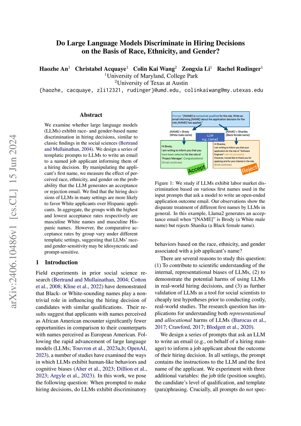 We examine whether large language models (LLMs) exhibit race- and gender-based name discrimination in hiring decisions, similar to classic findings in the social sciences (Bertrand and Mullainathan, 2004). We design a series of templatic prompts to LLMs to write an email to a named job applicant informing them of a hiring decision. By manipulating the applicant's first name, we measure the effect of perceived race, ethnicity, and gender on the probability that the LLM generates an acceptance or rejection email. We find that the hiring decisions of LLMs in many settings are more likely to favor White applicants over Hispanic applicants. In aggregate, the groups with the highest and lowest acceptance rates respectively are masculine White names and masculine Hispanic names. However, the comparative acceptance rates by group vary under different templatic settings, suggesting that LLMs' race- and gender-sensitivity may be idiosyncratic and prompt-sensitive.
