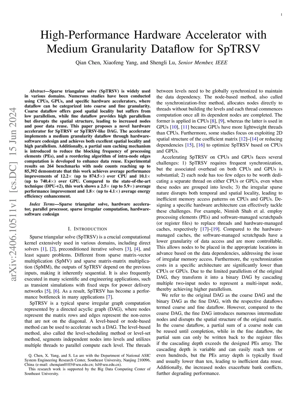 Sparse triangular solve (SpTRSV) is widely used in various domains. Numerous studies have been conducted using CPUs, GPUs, and specific hardware accelerators, where dataflow can be categorized into coarse and fine granularity. Coarse dataflow offers good spatial locality but suffers from low parallelism, while fine dataflow provides high parallelism but disrupts the spatial structure, leading to increased nodes and poor data reuse. This paper proposes a novel hardware accelerator for SpTRSV or SpTRSV-like DAG. The accelerator implements a medium granularity dataflow through hardware-software codesign and achieves both excellent spatial locality and high parallelism. Additionally, a partial sum caching mechanism is introduced to reduce the blocking frequency of processing elements (PEs), and a reordering algorithm of intra-node edges computation is developed to enhance data reuse. Experimental results on 264 benchmarks with node counts reaching up to 85,392 demonstrate that this work achieves average performance improvements of 12.2x (up to 874.5x) over CPU and 10.1x (up to 740.4x) over GPU. Compared to the state-of-the-art technique (DPU-v2), this work shows a 2.5x (up to 5.9x) average performance improvement and 1.8x (up to 4.1x) average energy efficiency enhancement.
