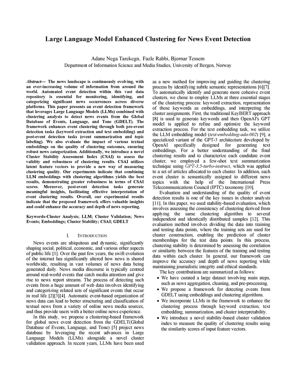 The news landscape is continuously evolving, with an ever-increasing volume of information from around the world. Automated event detection within this vast data repository is essential for monitoring, identifying, and categorizing significant news occurrences across diverse platforms. This paper presents an event detection framework that leverages Large Language Models (LLMs) combined with clustering analysis to detect news events from the Global Database of Events, Language, and Tone (GDELT). The framework enhances event clustering through both pre-event detection tasks (keyword extraction and text embedding) and post-event detection tasks (event summarization and topic labelling). We also evaluate the impact of various textual embeddings on the quality of clustering outcomes, ensuring robust news categorization. Additionally, we introduce a novel Cluster Stability Assessment Index (CSAI) to assess the validity and robustness of clustering results. CSAI utilizes multiple feature vectors to provide a new way of measuring clustering quality. Our experiments indicate that the use of LLM embedding in the event detection framework has significantly improved the results, demonstrating greater robustness in terms of CSAI scores. Moreover, post-event detection tasks generate meaningful insights, facilitating effective interpretation of event clustering results. Overall, our experimental results indicate that the proposed framework offers valuable insights and could enhance the accuracy in news analysis and reporting.