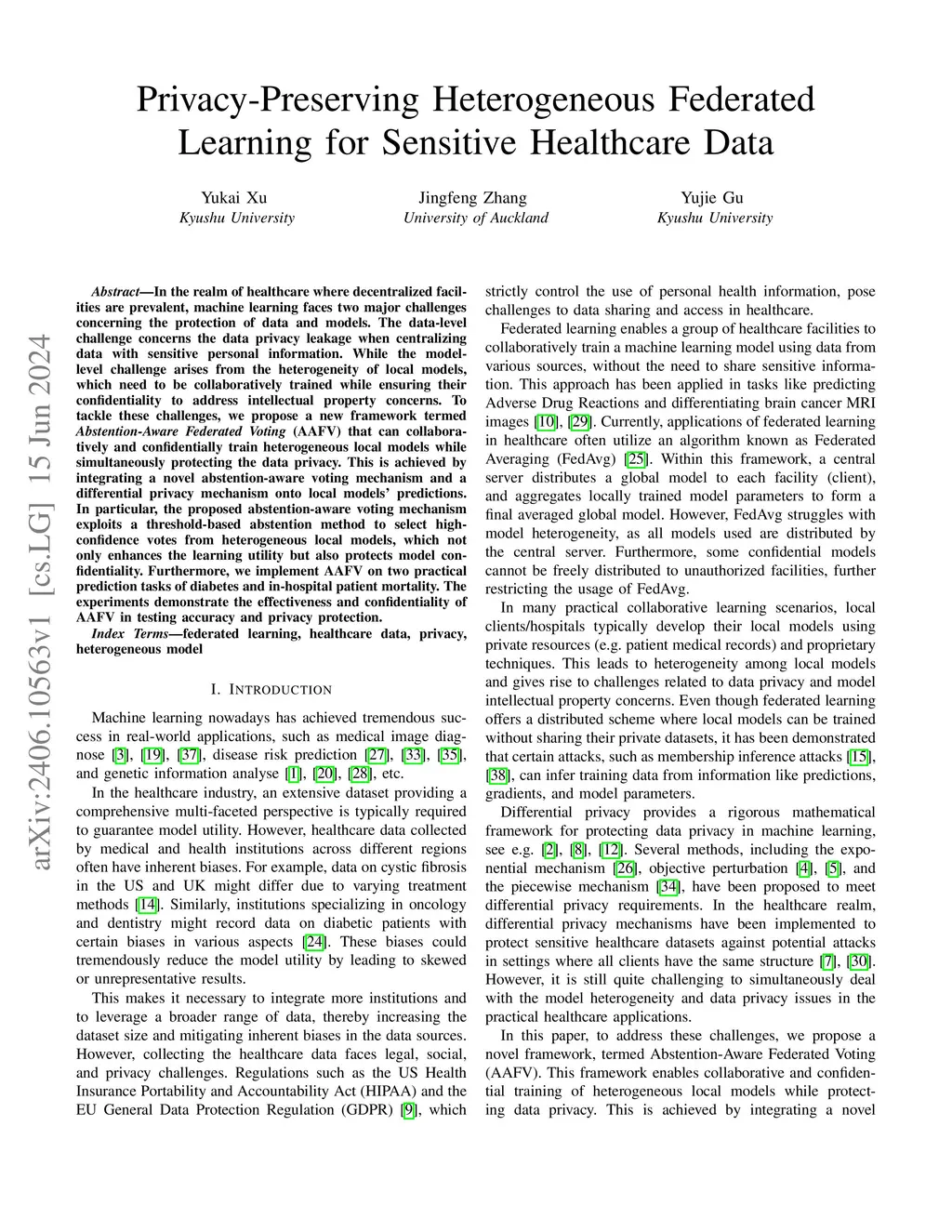 In the realm of healthcare where decentralized facilities are prevalent, machine learning faces two major challenges concerning the protection of data and models. The data-level challenge concerns the data privacy leakage when centralizing data with sensitive personal information. While the model-level challenge arises from the heterogeneity of local models, which need to be collaboratively trained while ensuring their confidentiality to address intellectual property concerns. To tackle these challenges, we propose a new framework termed Abstention-Aware Federated Voting (AAFV) that can collaboratively and confidentially train heterogeneous local models while simultaneously protecting the data privacy. This is achieved by integrating a novel abstention-aware voting mechanism and a differential privacy mechanism onto local models' predictions. In particular, the proposed abstention-aware voting mechanism exploits a threshold-based abstention method to select high-confidence votes from heterogeneous local models, which not only enhances the learning utility but also protects model confidentiality. Furthermore, we implement AAFV on two practical prediction tasks of diabetes and in-hospital patient mortality. The experiments demonstrate the effectiveness and confidentiality of AAFV in testing accuracy and privacy protection.