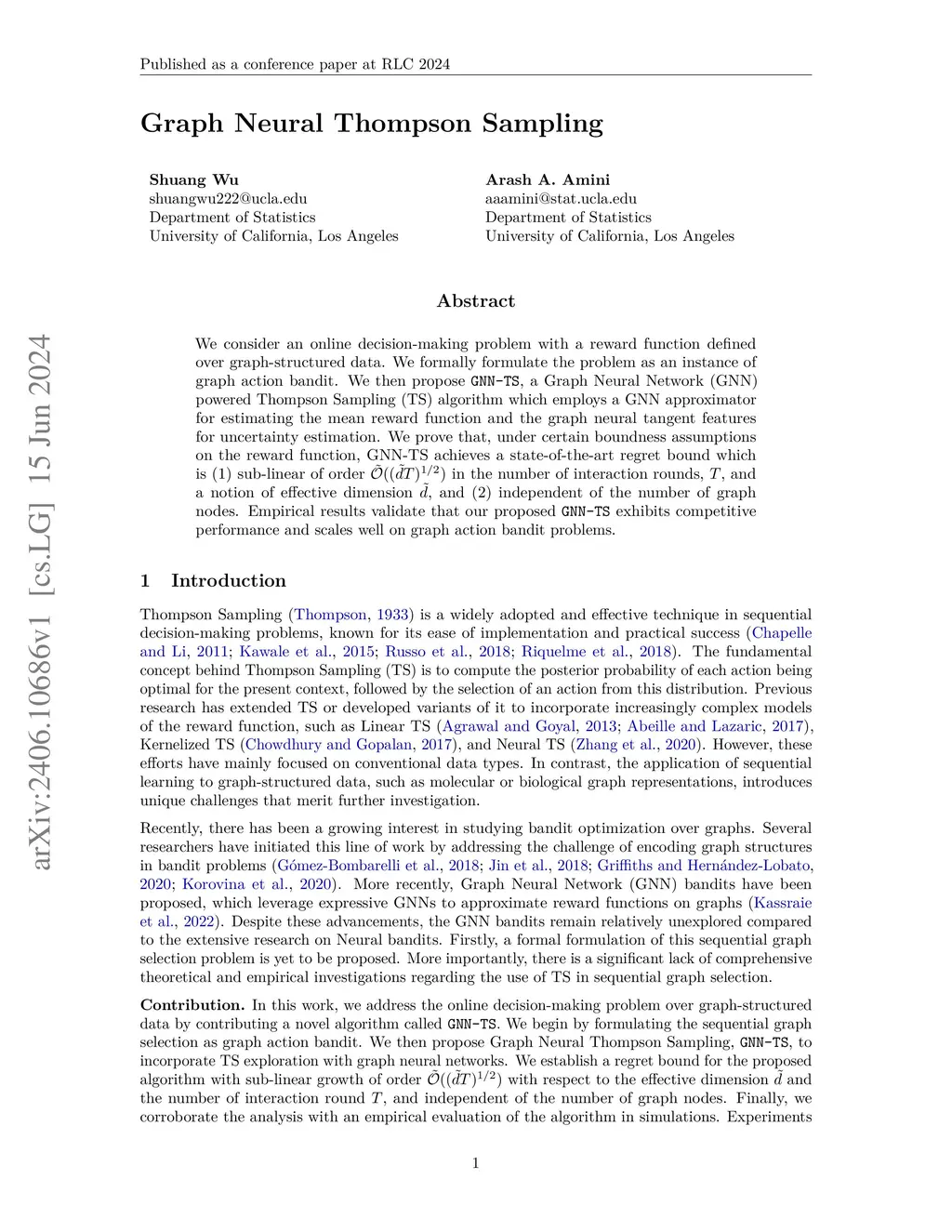 We consider an online decision-making problem with a reward function defined over graph-structured data. We formally formulate the problem as an instance of graph action bandit. We then propose \texttt{GNN-TS}, a Graph Neural Network (GNN) powered Thompson Sampling (TS) algorithm which employs a GNN approximator for estimating the mean reward function and the graph neural tangent features for uncertainty estimation. We prove that, under certain boundness assumptions on the reward function, GNN-TS achieves a state-of-the-art regret bound which is (1) sub-linear of order in the number of interaction rounds, , and a notion of effective dimension , and (2) independent of the number of graph nodes. Empirical results validate that our proposed \texttt{GNN-TS} exhibits competitive performance and scales well on graph action bandit problems.