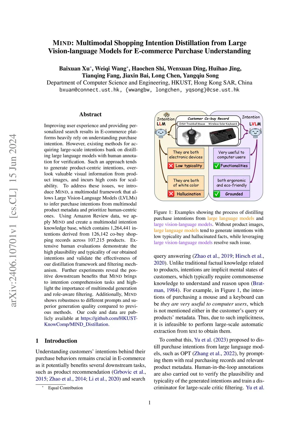 Improving user experience and providing personalized search results in E-commerce platforms heavily rely on understanding purchase intention. However, existing methods for acquiring large-scale intentions bank on distilling large language models with human annotation for verification. Such an approach tends to generate product-centric intentions, overlook valuable visual information from product images, and incurs high costs for scalability. To address these issues, we introduce MIND, a multimodal framework that allows Large Vision-Language Models (LVLMs) to infer purchase intentions from multimodal product metadata and prioritize human-centric ones. Using Amazon Review data, we apply MIND and create a multimodal intention knowledge base, which contains 1,264,441 million intentions derived from 126,142 co-buy shopping records across 107,215 products. Extensive human evaluations demonstrate the high plausibility and typicality of our obtained intentions and validate the effectiveness of our distillation framework and filtering mechanism. Additional experiments reveal that our obtained intentions significantly enhance large language models in two intention comprehension tasks.