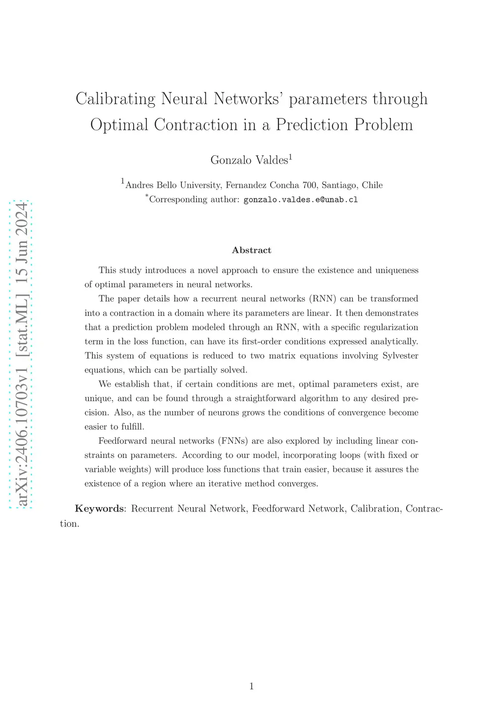 This study introduces a novel approach to ensure the existence and uniqueness of optimal parameters in neural networks. The paper details how a recurrent neural networks (RNN) can be transformed into a contraction in a domain where its parameters are linear. It then demonstrates that a prediction problem modeled through an RNN, with a specific regularization term in the loss function, can have its first-order conditions expressed analytically. This system of equations is reduced to two matrix equations involving Sylvester equations, which can be partially solved. We establish that, if certain conditions are met, optimal parameters exist, are unique, and can be found through a straightforward algorithm to any desired precision. Also, as the number of neurons grows the conditions of convergence become easier to fulfill. Feedforward neural networks (FNNs) are also explored by including linear constraints on parameters. According to our model, incorporating loops (with fixed or variable weights) will produce loss functions that train easier, because it assures the existence of a region where an iterative method converges.