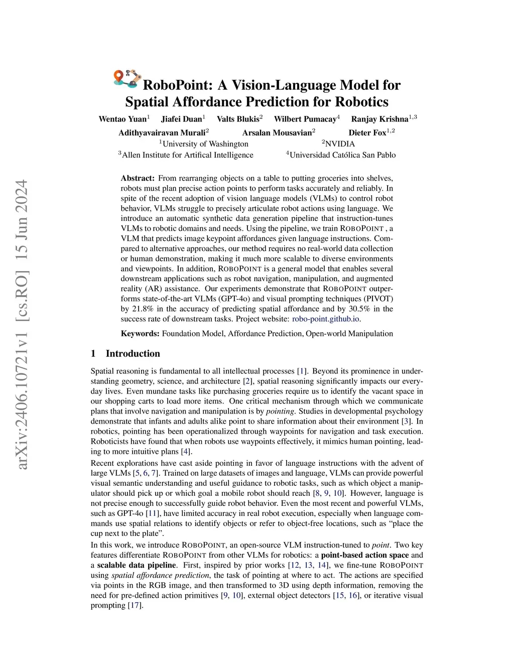 From rearranging objects on a table to putting groceries into shelves, robots must plan precise action points to perform tasks accurately and reliably. In spite of the recent adoption of vision language models (VLMs) to control robot behavior, VLMs struggle to precisely articulate robot actions using language. We introduce an automatic synthetic data generation pipeline that instruction-tunes VLMs to robotic domains and needs. Using the pipeline, we train RoboPoint, a VLM that predicts image keypoint affordances given language instructions. Compared to alternative approaches, our method requires no real-world data collection or human demonstration, making it much more scalable to diverse environments and viewpoints. In addition, RoboPoint is a general model that enables several downstream applications such as robot navigation, manipulation, and augmented reality (AR) assistance. Our experiments demonstrate that RoboPoint outperforms state-of-the-art VLMs (GPT-4o) and visual prompting techniques (PIVOT) by 21.8% in the accuracy of predicting spatial affordance and by 30.5% in the success rate of downstream tasks. Project website: https://robo-point.github.io.