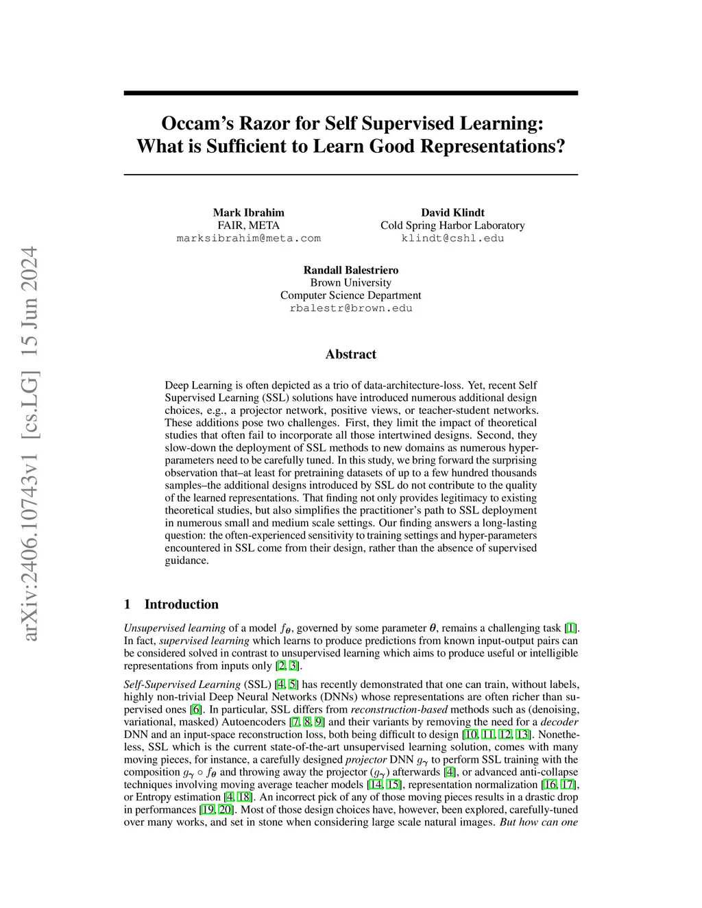 Deep Learning is often depicted as a trio of data-architecture-loss. Yet, recent Self Supervised Learning (SSL) solutions have introduced numerous additional design choices, e.g., a projector network, positive views, or teacher-student networks. These additions pose two challenges. First, they limit the impact of theoretical studies that often fail to incorporate all those intertwined designs. Second, they slow-down the deployment of SSL methods to new domains as numerous hyper-parameters need to be carefully tuned. In this study, we bring forward the surprising observation that--at least for pretraining datasets of up to a few hundred thousands samples--the additional designs introduced by SSL do not contribute to the quality of the learned representations. That finding not only provides legitimacy to existing theoretical studies, but also simplifies the practitioner's path to SSL deployment in numerous small and medium scale settings. Our finding answers a long-lasting question: the often-experienced sensitivity to training settings and hyper-parameters encountered in SSL come from their design, rather than the absence of supervised guidance.