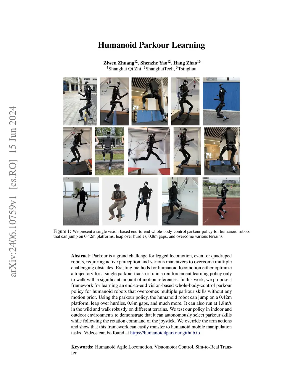 Parkour is a grand challenge for legged locomotion, even for quadruped robots, requiring active perception and various maneuvers to overcome multiple challenging obstacles. Existing methods for humanoid locomotion either optimize a trajectory for a single parkour track or train a reinforcement learning policy only to walk with a significant amount of motion references. In this work, we propose a framework for learning an end-to-end vision-based whole-body-control parkour policy for humanoid robots that overcomes multiple parkour skills without any motion prior. Using the parkour policy, the humanoid robot can jump on a 0.42m platform, leap over hurdles, 0.8m gaps, and much more. It can also run at 1.8m/s in the wild and walk robustly on different terrains. We test our policy in indoor and outdoor environments to demonstrate that it can autonomously select parkour skills while following the rotation command of the joystick. We override the arm actions and show that this framework can easily transfer to humanoid mobile manipulation tasks. Videos can be found at https://humanoid4parkour.github.io