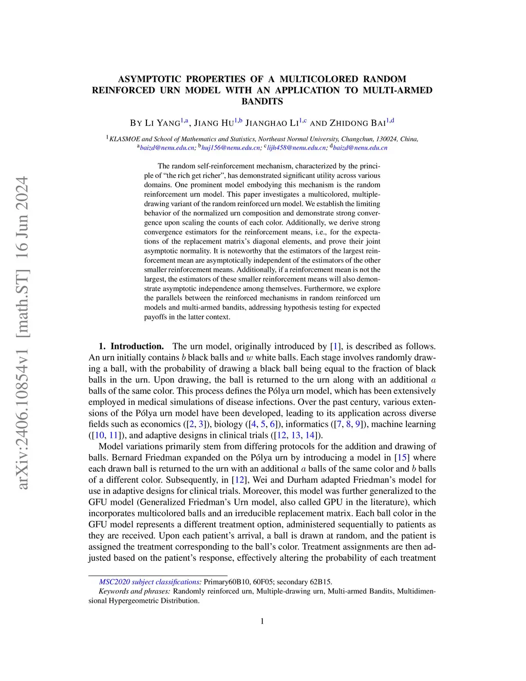 The random self-reinforcement mechanism, characterized by the principle of ``the rich get richer'', has demonstrated significant utility across various domains. One prominent model embodying this mechanism is the random reinforcement urn model. This paper investigates a multicolored, multiple-drawing variant of the random reinforced urn model. We establish the limiting behavior of the normalized urn composition and demonstrate strong convergence upon scaling the counts of each color. Additionally, we derive strong convergence estimators for the reinforcement means, i.e., for the expectations of the replacement matrix's diagonal elements, and prove their joint asymptotic normality. It is noteworthy that the estimators of the largest reinforcement mean are asymptotically independent of the estimators of the other smaller reinforcement means. Additionally, if a reinforcement mean is not the largest, the estimators of these smaller reinforcement means will also demonstrate asymptotic independence among themselves. Furthermore, we explore the parallels between the reinforced mechanisms in random reinforced urn models and multi-armed bandits, addressing hypothesis testing for expected payoffs in the latter context.