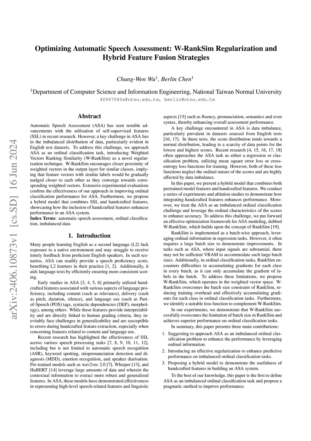 Automatic Speech Assessment (ASA) has seen notable advancements with the utilization of self-supervised features (SSL) in recent research. However, a key challenge in ASA lies in the imbalanced distribution of data, particularly evident in English test datasets. To address this challenge, we approach ASA as an ordinal classification task, introducing Weighted Vectors Ranking Similarity (W-RankSim) as a novel regularization technique. W-RankSim encourages closer proximity of weighted vectors in the output layer for similar classes, implying that feature vectors with similar labels would be gradually nudged closer to each other as they converge towards corresponding weighted vectors. Extensive experimental evaluations confirm the effectiveness of our approach in improving ordinal classification performance for ASA. Furthermore, we propose a hybrid model that combines SSL and handcrafted features, showcasing how the inclusion of handcrafted features enhances performance in an ASA system.