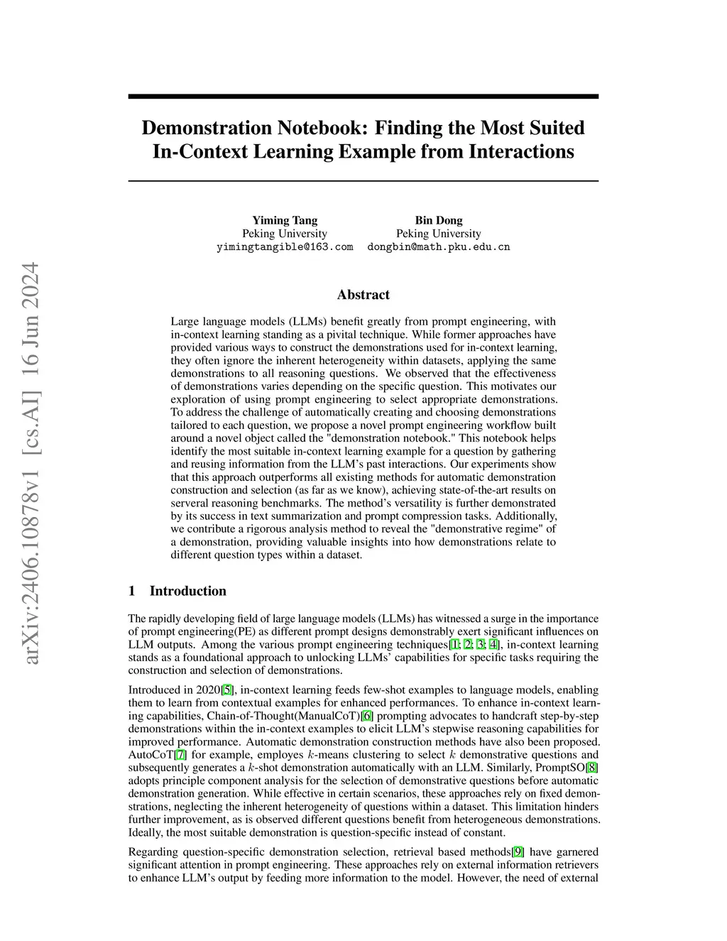 Large language models (LLMs) benefit greatly from prompt engineering, with in-context learning standing as a pivital technique. While former approaches have provided various ways to construct the demonstrations used for in-context learning, they often ignore the inherent heterogeneity within datasets, applying the same demonstrations to all reasoning questions. We observed that the effectiveness of demonstrations varies depending on the specific question. This motivates our exploration of using prompt engineering to select appropriate demonstrations. To address the challenge of automatically creating and choosing demonstrations tailored to each question, we propose a novel prompt engineering workflow built around a novel object called the "demonstration notebook." This notebook helps identify the most suitable in-context learning example for a question by gathering and reusing information from the LLM's past interactions. Our experiments show that this approach outperforms all existing methods for automatic demonstration construction and selection (as far as we know), achieving state-of-the-art results on serveral reasoning benchmarks. The method's versatility is further demonstrated by its success in text summarization and prompt compression tasks. Additionally, we contribute a rigorous analysis method to reveal the "demonstrative regime" of a demonstration, providing valuable insights into how demonstrations relate to different question types within a dataset.